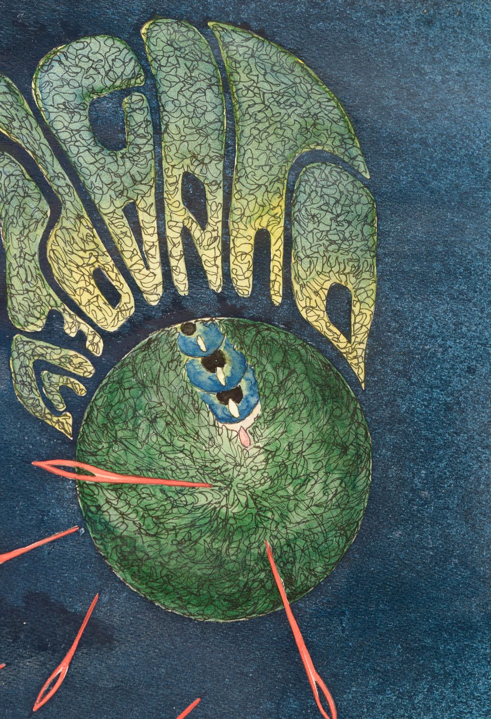 Surrealist composition with symbolic and dreamlike elements. The motif depicts an abstract spatial scene with a green spherical form and stylised wing-like shapes surrounded by red linear elements against a deep blue background, above a geometric field filled with numbers and signs.