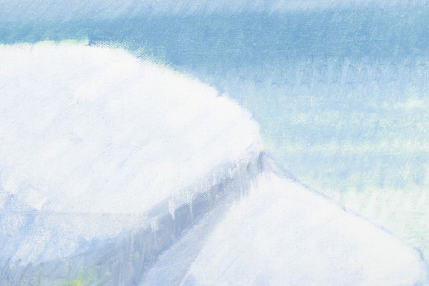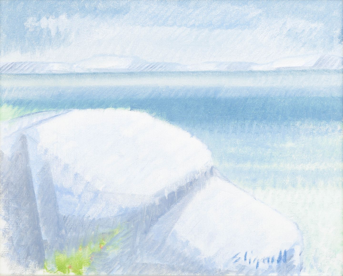 Landskabsmotiv udført i dæmpede, lyse farvetoner med en stiliseret gengivelse af klippeformationer i forgrunden og vand samt fjern horisont i baggrunden. Kompositionen er karakteriseret ved en rolig, næsten grafisk opbygning og en reduceret farvepalet typisk for nordisk modernistisk landskabsmaleri fra midten af det 20. århundrede.