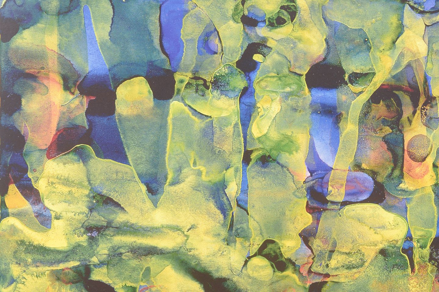 Abstrakt komposition udført som farvetryk med flydende, organiske former i lag af grønne, blå, gule og violette toner. Motivet har en karakteristisk opløst struktur med vertikale spor og transparente farvefelter. Signeret i trykket og dateret 1991.