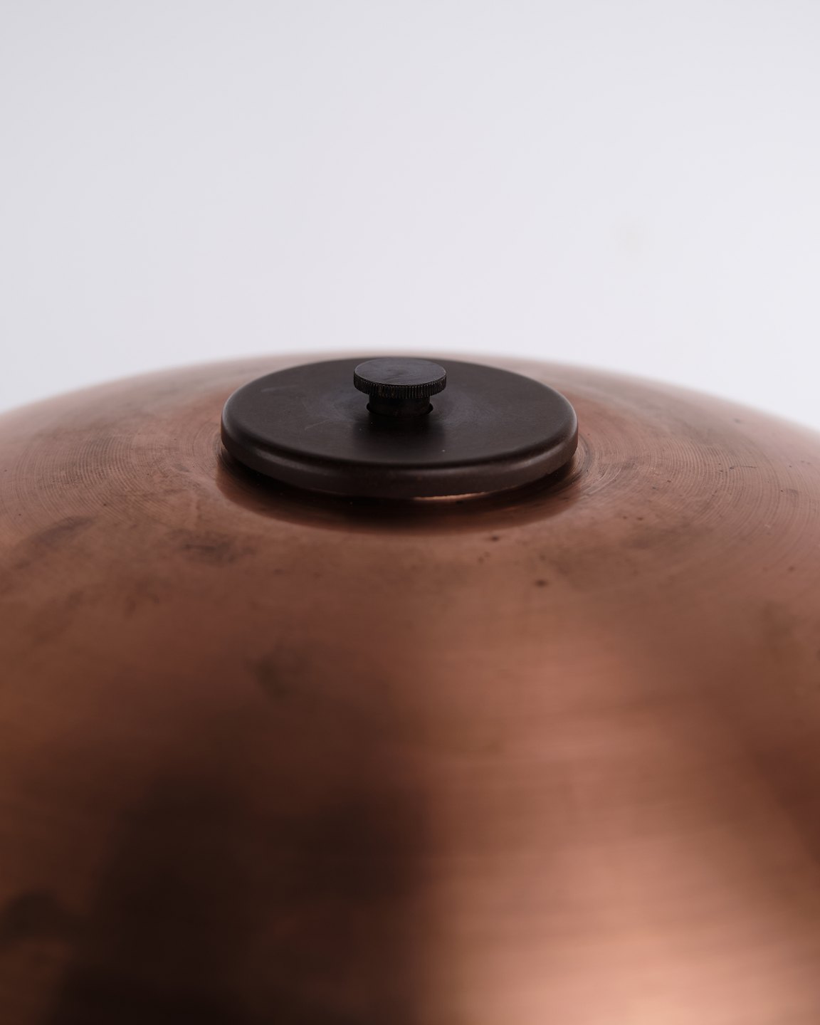 PH 3,5/2 bordlampe designet af Poul Henningsen og fremstillet af Louis Poulsen i 1930’erne. Lampen er udført med overskærm i kobber, ravfarvede glasskærme og fod i bruneret messing.