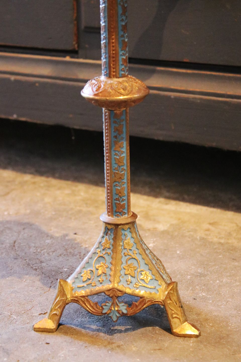 Antik fransk kirkestage til et bloklys i messing med turkisblå bemaling...