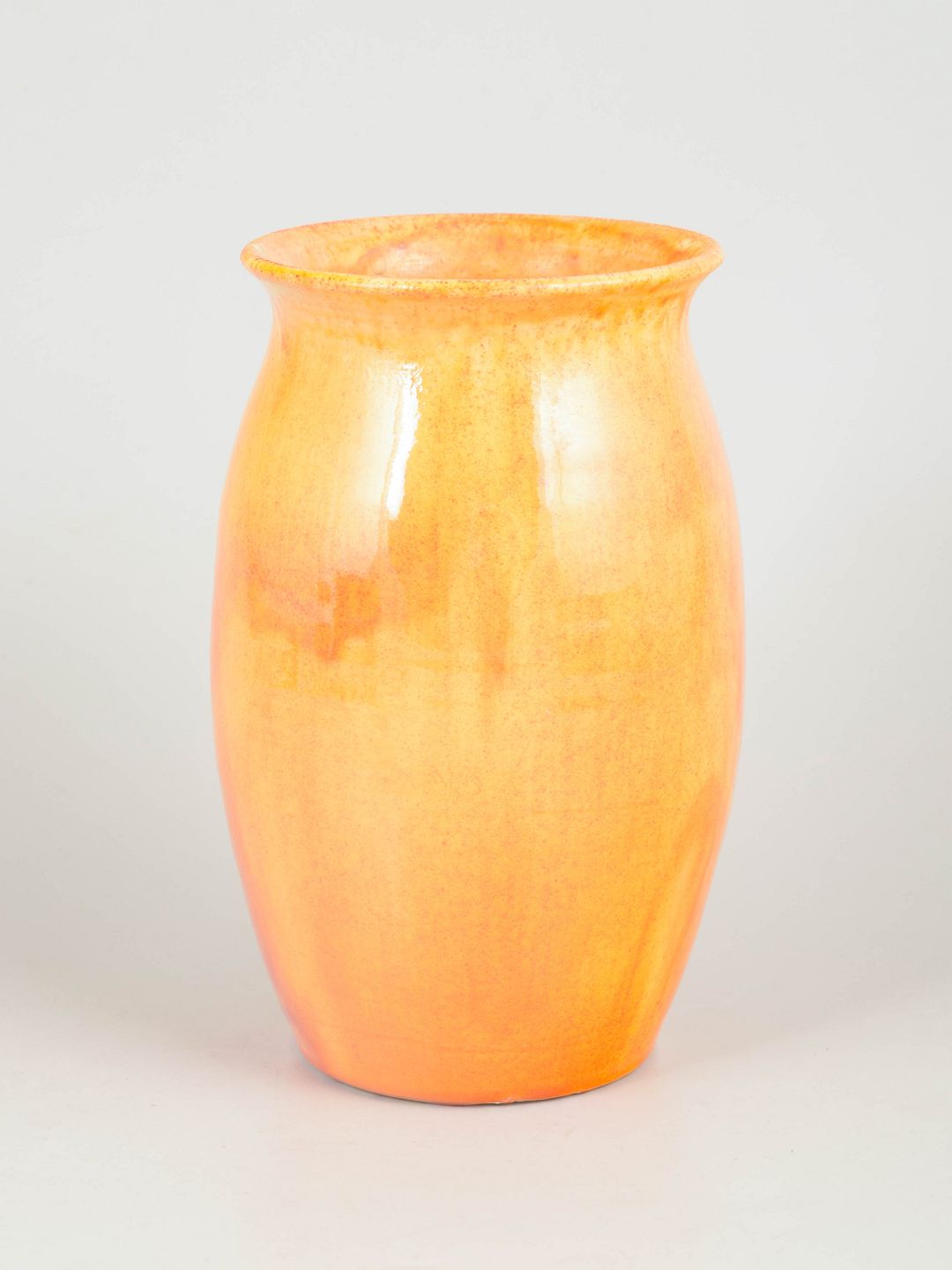 Elegant vase i glaseret lertøj med blød, let konisk form og svagt udadbøjet rand. Udført i lys gul glasur med varme orange nuancer og fine lodrette løb, der giver et levende og organisk udtryk. Signeret HAK i bunden.
