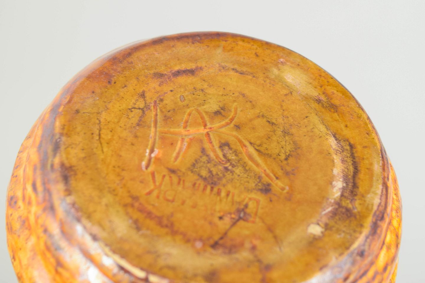 Dekorativ krukke i glaseret lertøj med modellering af slange langs randen. Udført i kraftig gul/orange krakeléglasur med levende spil i overfladen. Signeret HAK i bunden. Fremstår med produktionsfejl i form af revne ved randen, opstået under brænding.