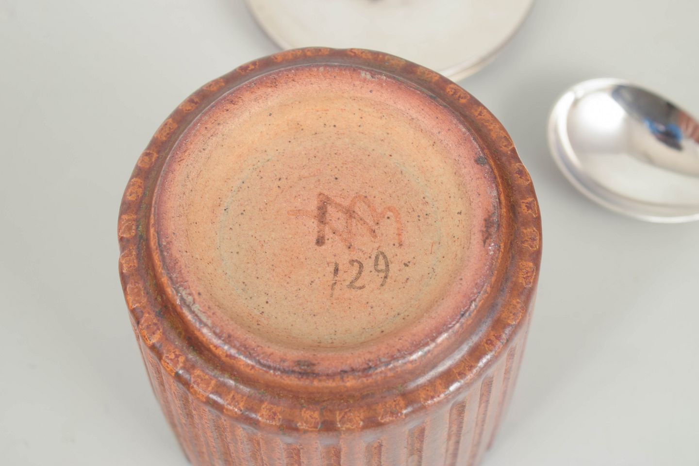 Hånddrejet cylindrisk stentøjskrukke med modelnummer 129, udført med lodret riflet korpus og varm rødbrun glasur med levende overfladespil. Monteret med låg samt ske fra Georg Jensen i Konge-mønster, udført i 1940’erne i et stilrent art deco udtryk.