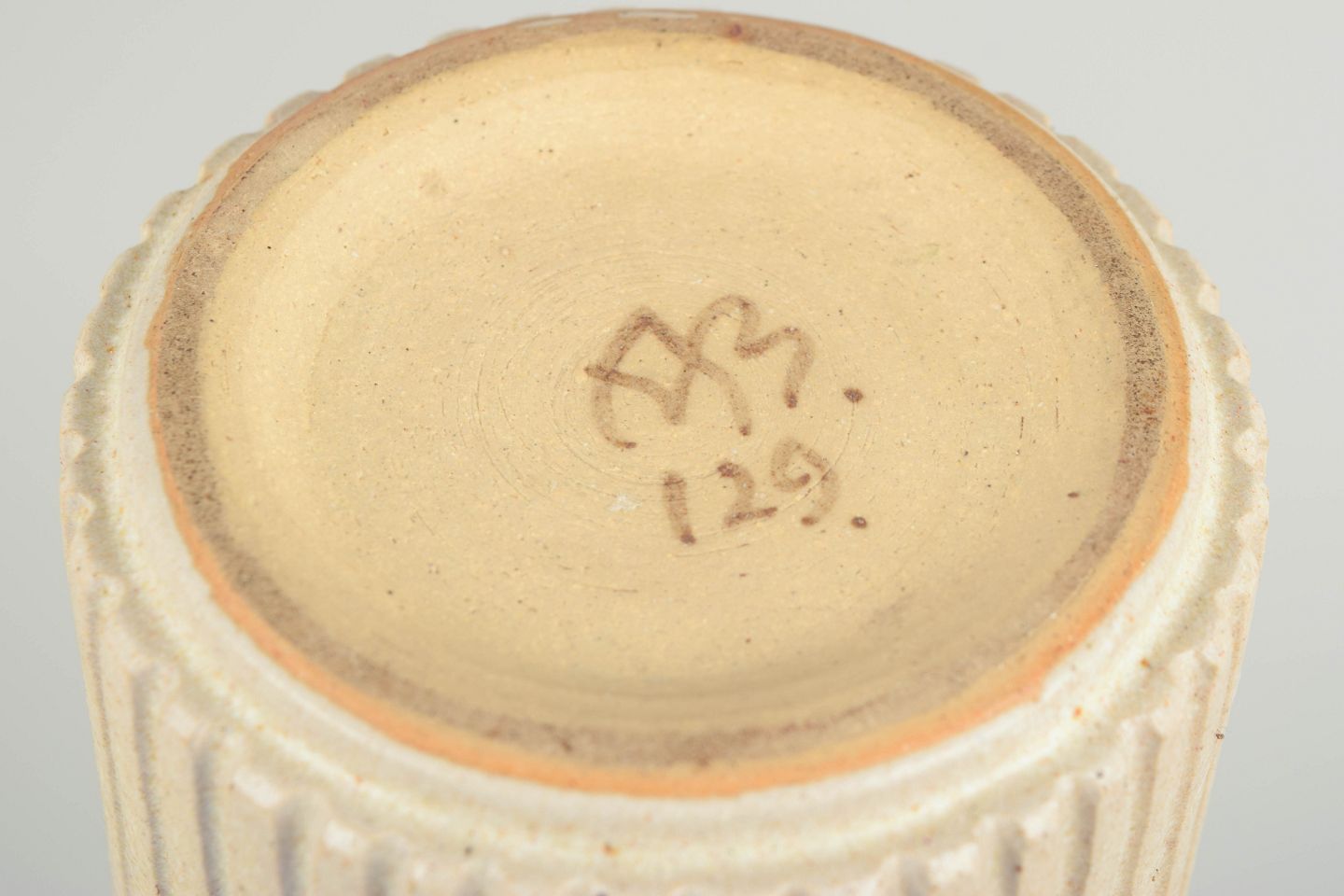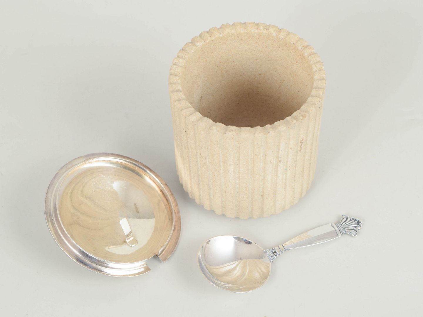 Hånddrejet cylindrisk stentøjskrukke med lodret riflet korpus og lys, mat glasur. Monteret med låg i sterlingsølv samt ske fra Georg Jensen, i det klassiske dronninge-mønster, udført i 1940’erne.