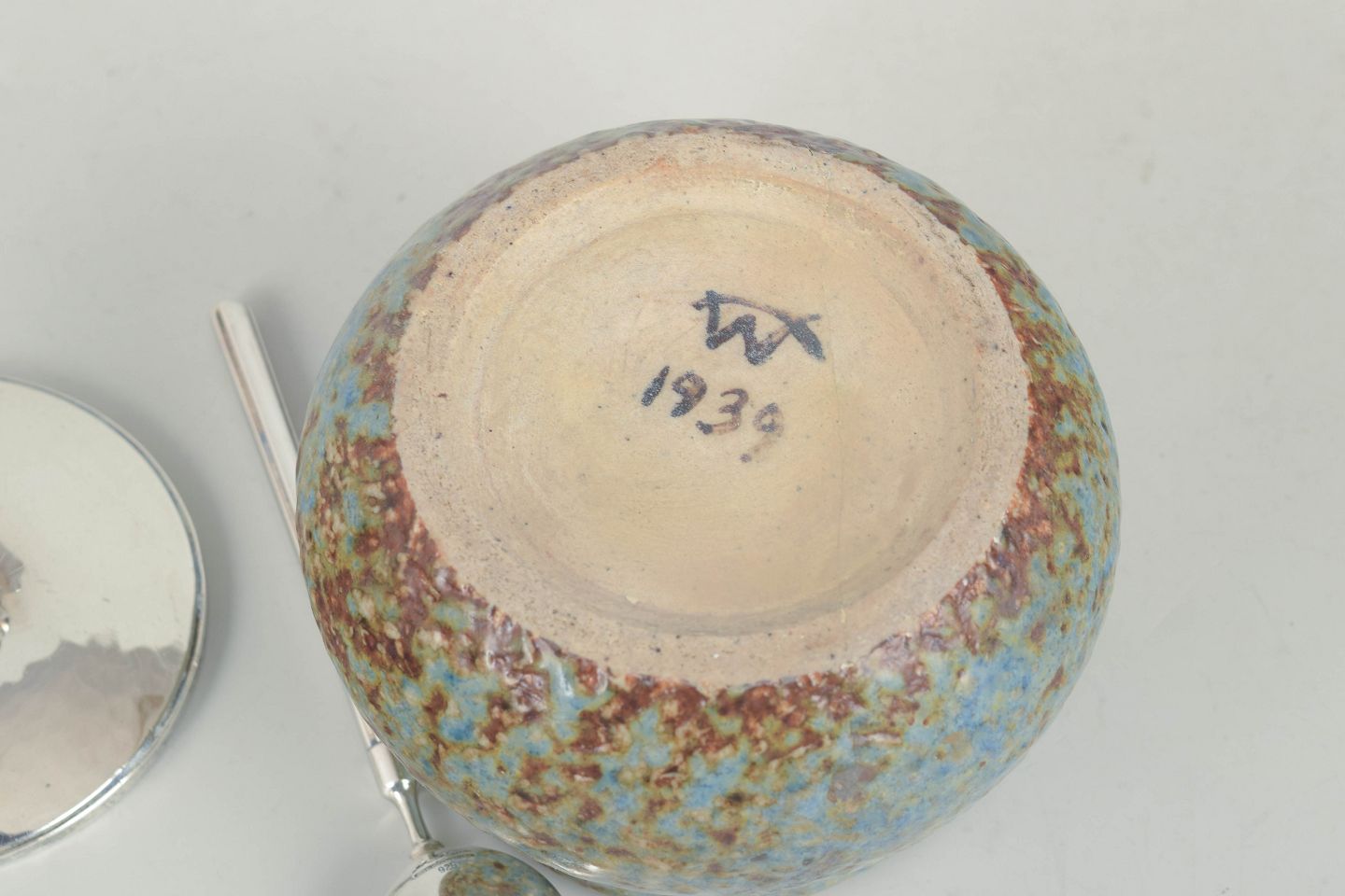 Hånddrejet stentøjskrukke med rund, let udadbøjet form og flerfarvet glasur i blå, grønne og brunlige nuancer. Monteret med låg og ske i sterlingsølv udført af Hans Hansen, i en elegant art deco udformning fra 1939.