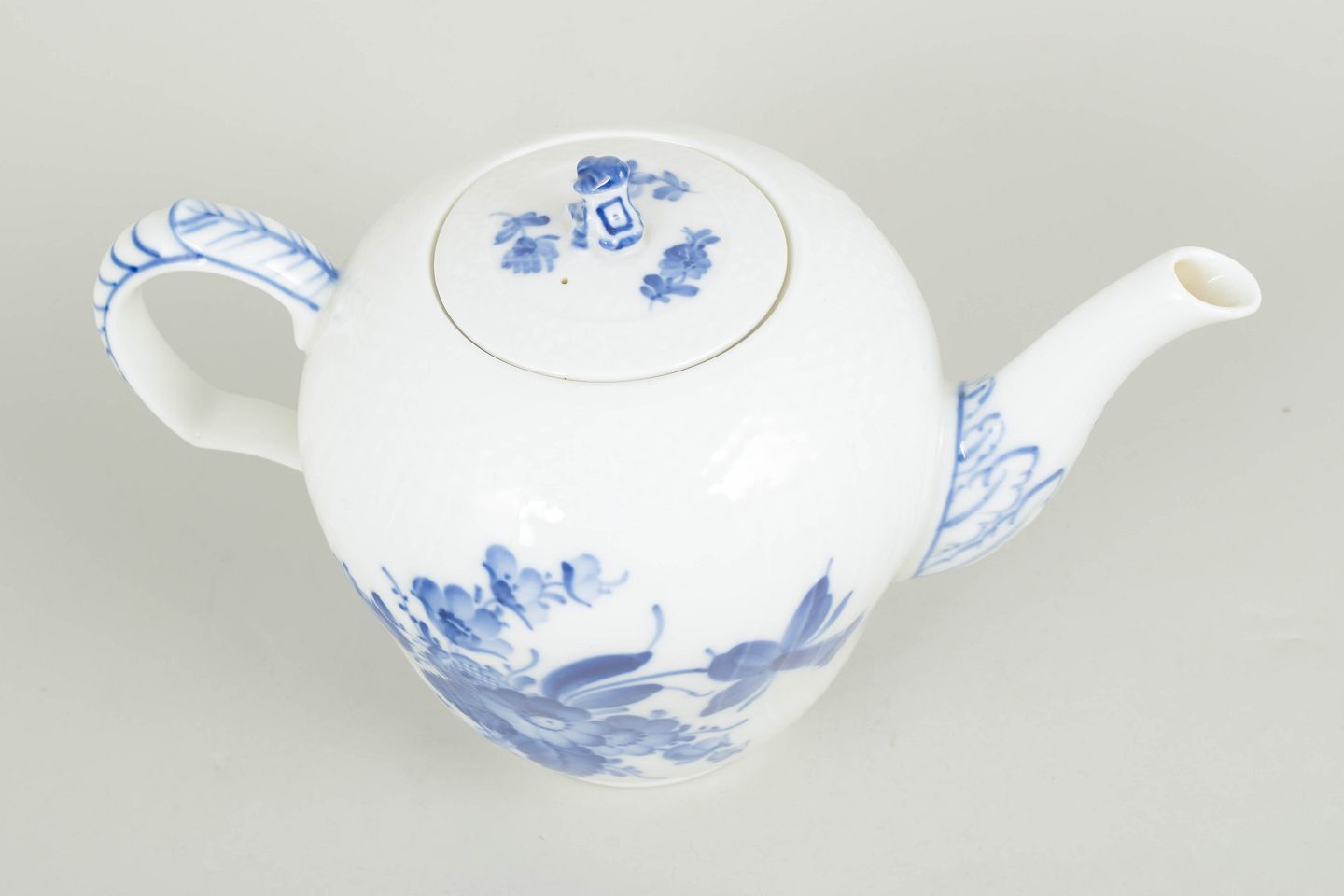 Tekande i porcelæn med låg og hank, dekoreret med håndmalet blå blomsterdekoration i relief.