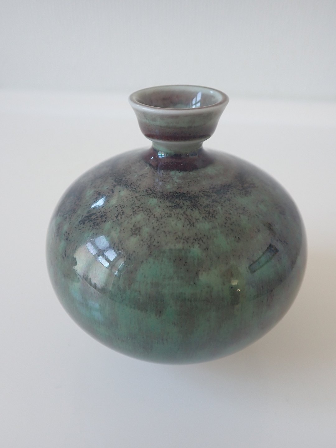 Berndt Friberg (1899 - 1981 )- Lille, buttet vase i stentøj med lille krave med blank grøn/brun/sort spættet glasur. Stemblet Friberg 77, Studio-hånd fra Gustavsberg. Højde: 8,7 cm. Bredde: ca. 7,5 cm. I fin stand.