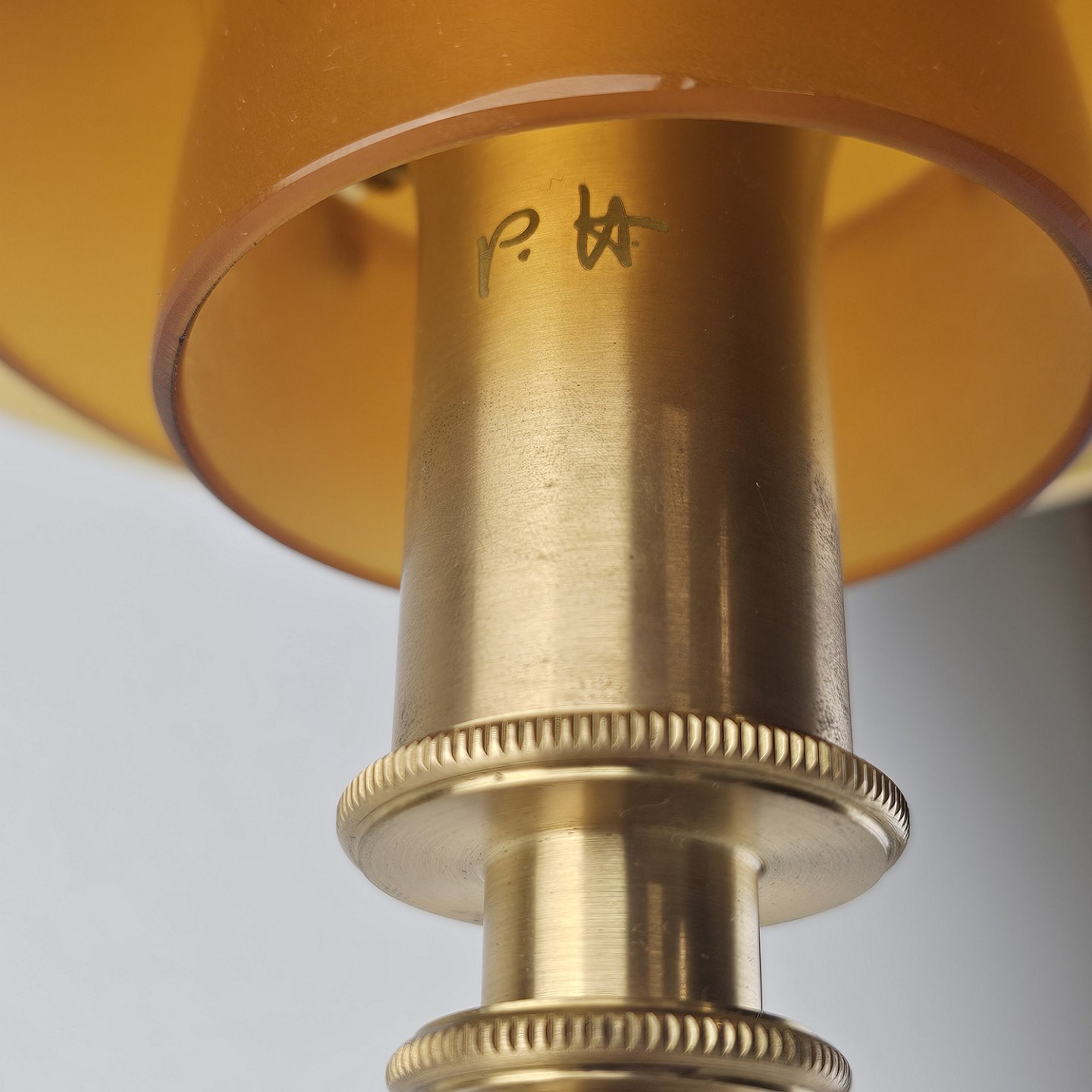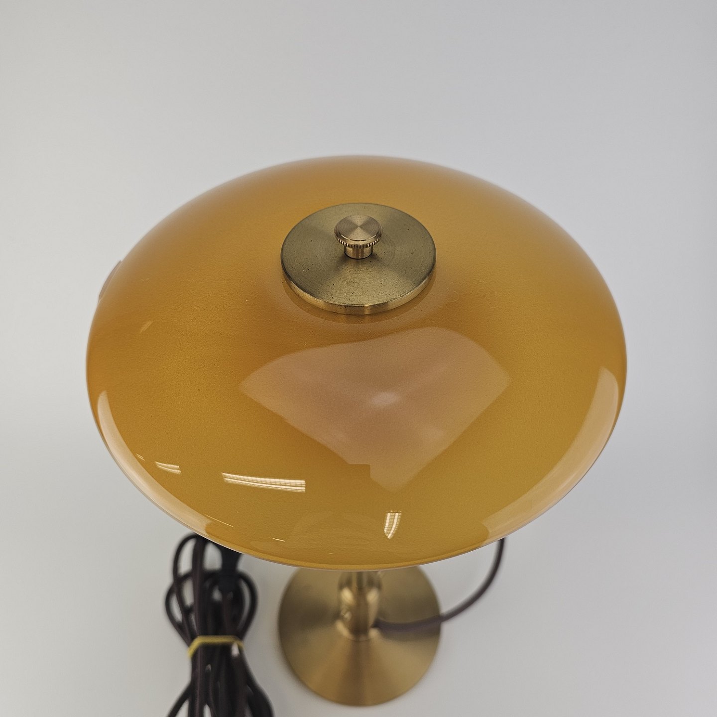 Bordlampe PH 3/2 med skærm af mundblæst ravfarvet etlagsglas og fod af strøgslebet messing