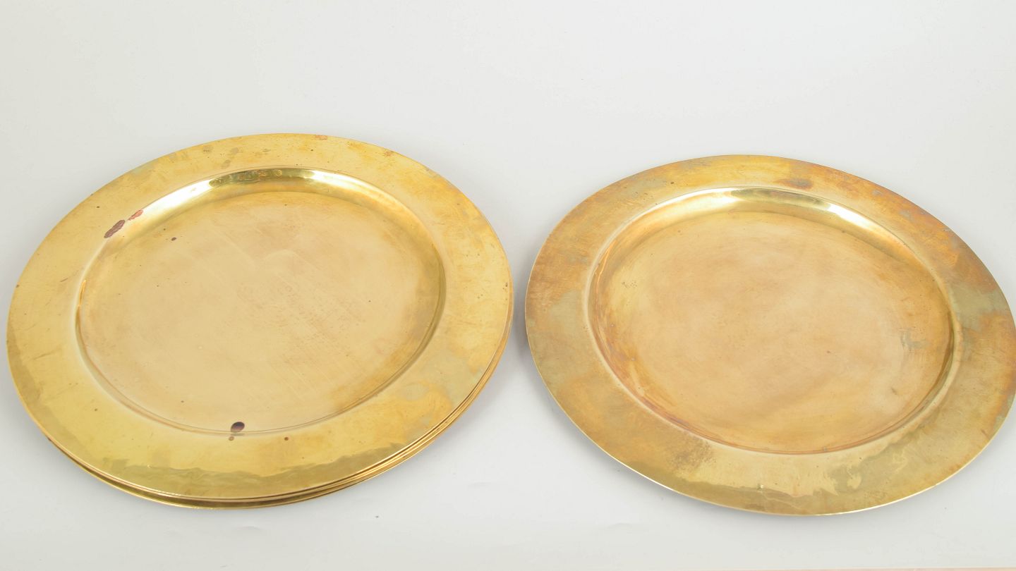Skandinavisk design, sæt af seks dækketallerkener i messing.