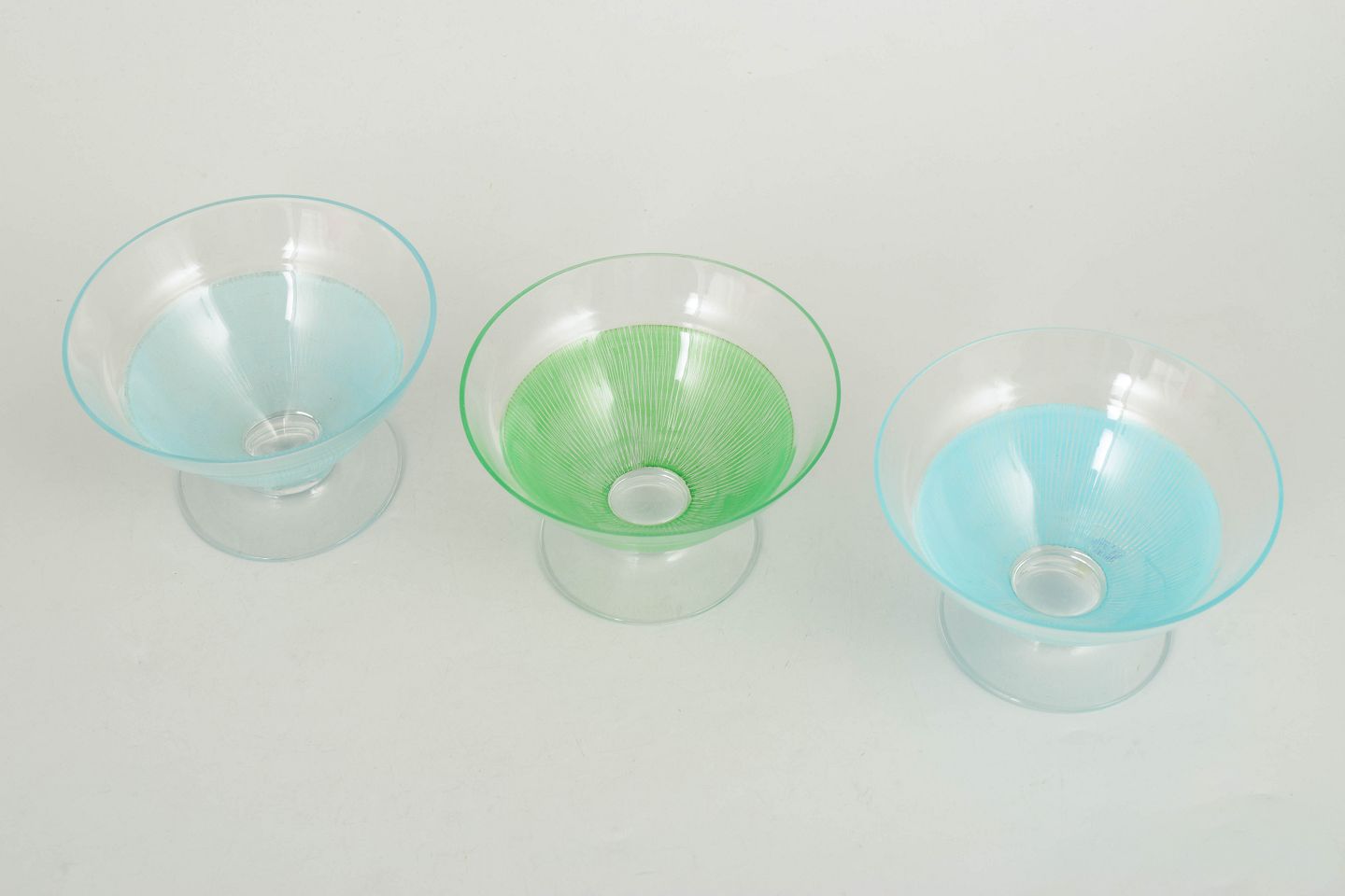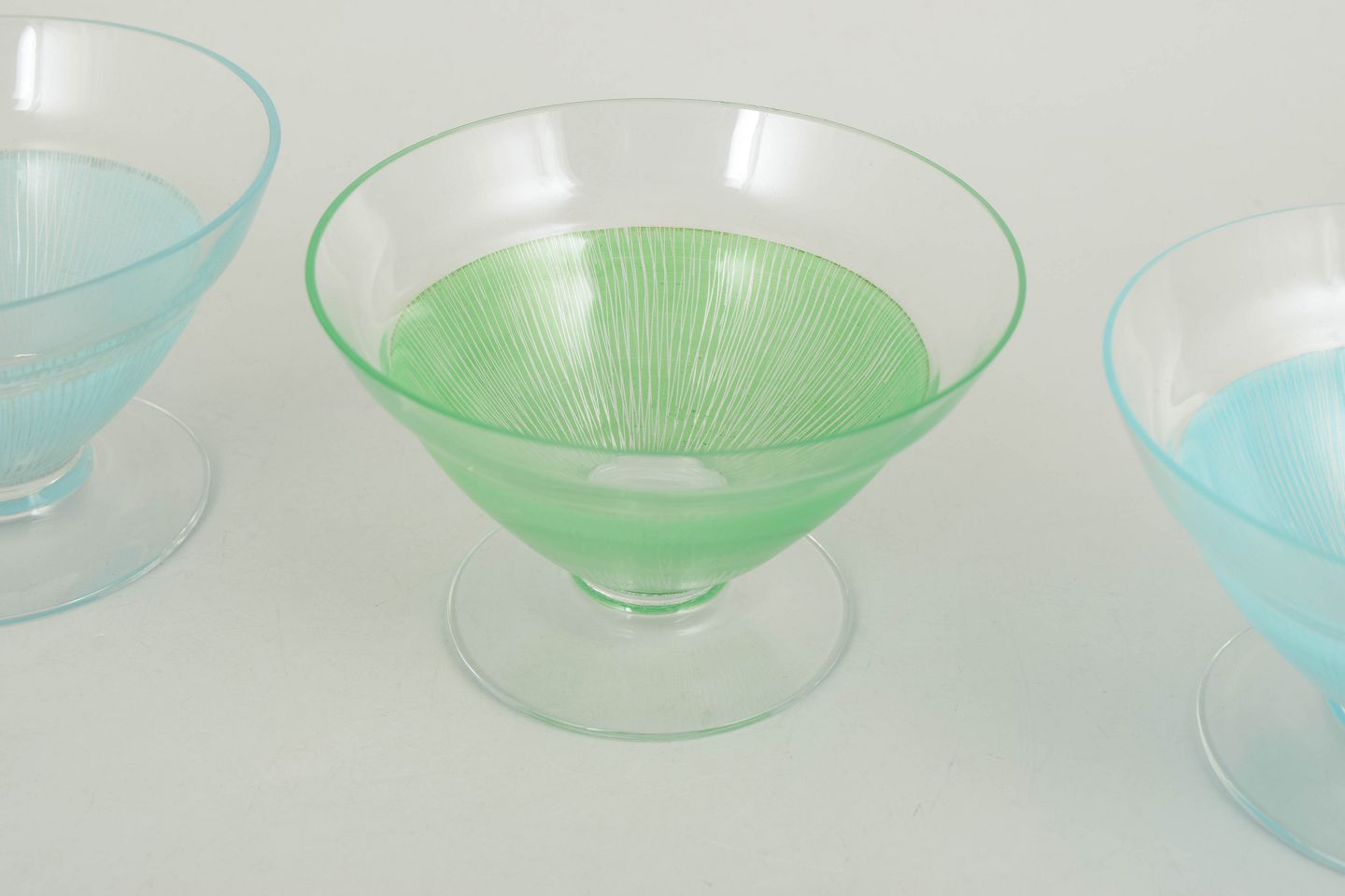 Elegante glas i klart glas med fine indfarvede ribbede strukturer i blå og grønne nuancer. Lette og dekorative former fra 1960’erne, velegnede som både cocktailglas og dessertskåle.