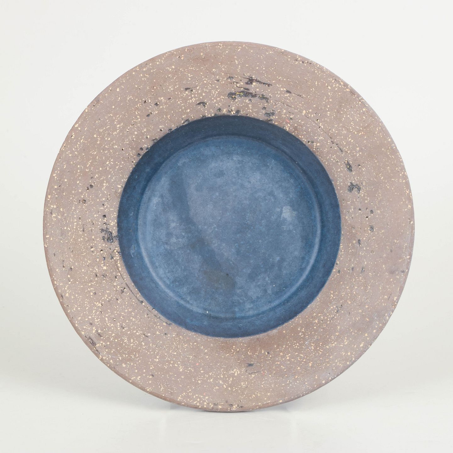 Decorative circular stoneware dish with matte glaze in blue and sandy tones with a speckled surface. Model 4070B.