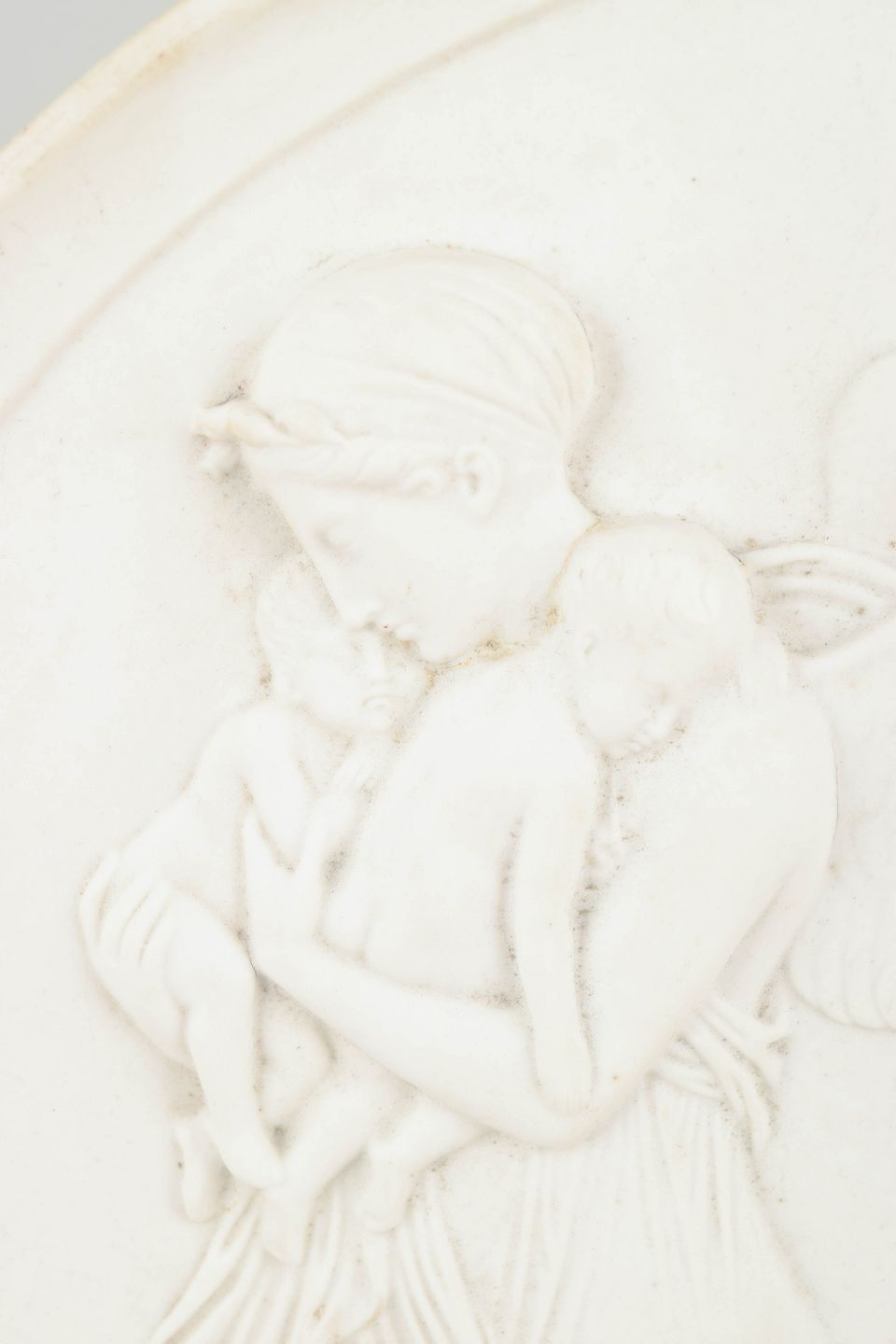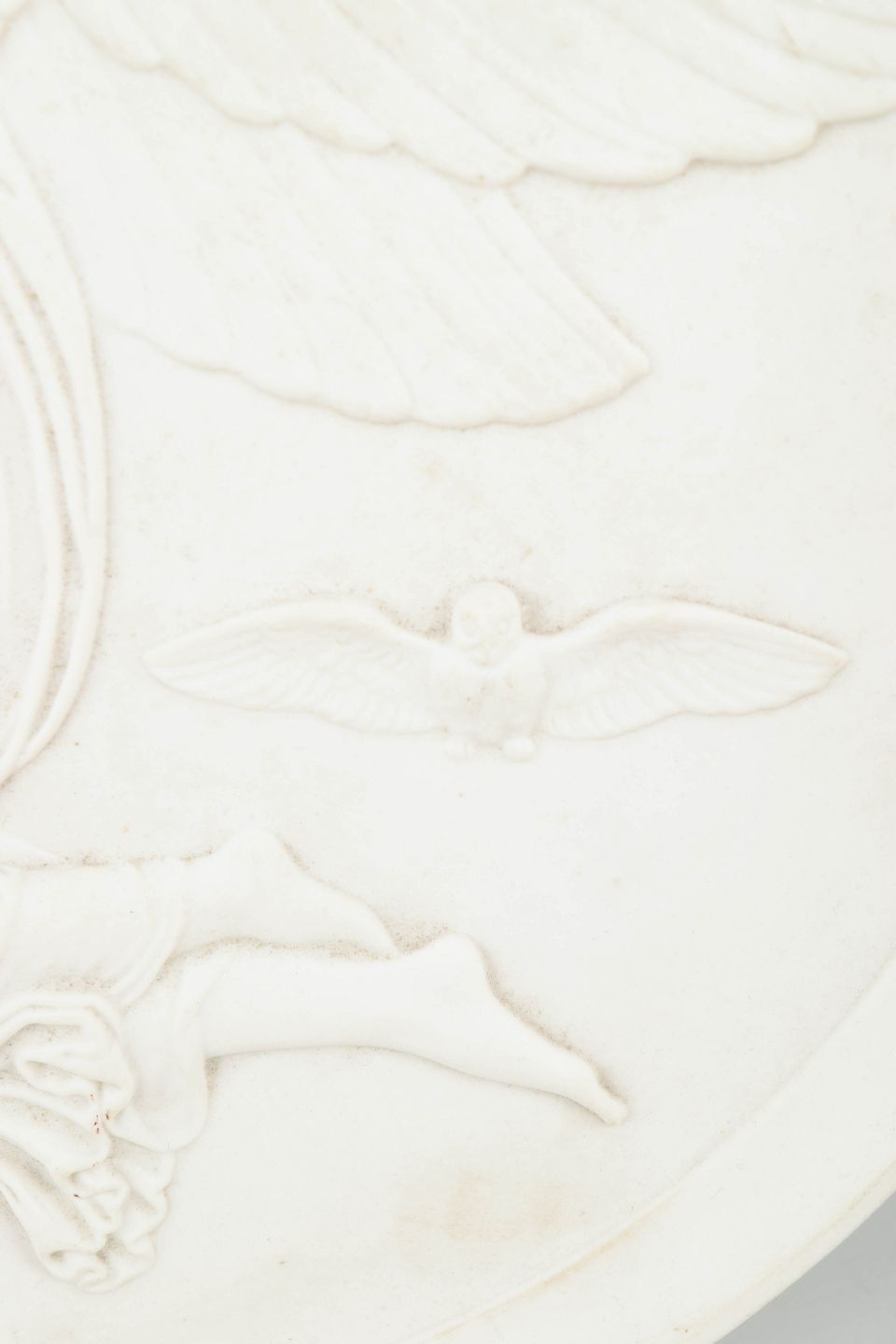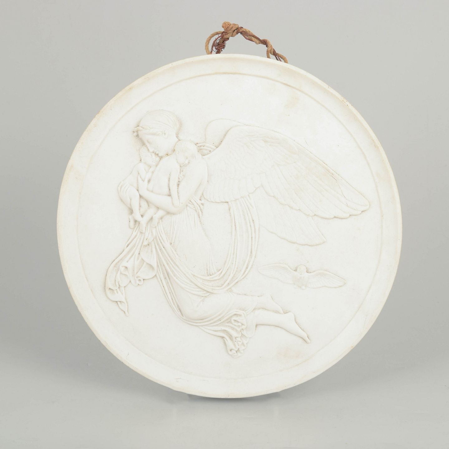 Rund vægplakette i hvidt bisquitporcelæn med relief af engelmotiv efter Bertel Thorvaldsen, udført med fine klassicistiske detaljer og blød modellering.