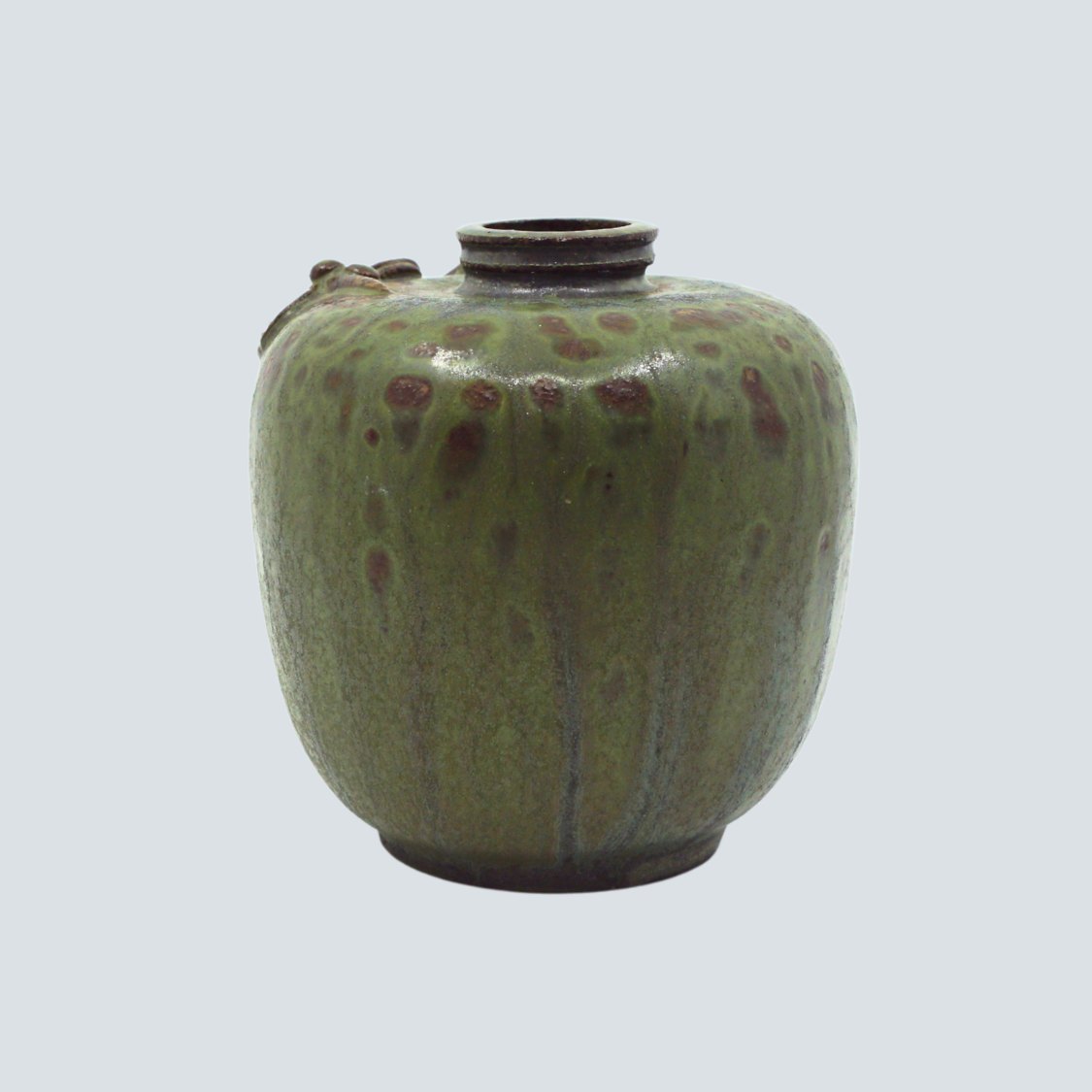 Arne Bang; Lille vase af stentøj, dekoreret med blomstergren. I grøn og brunlig glasur. I god stand.