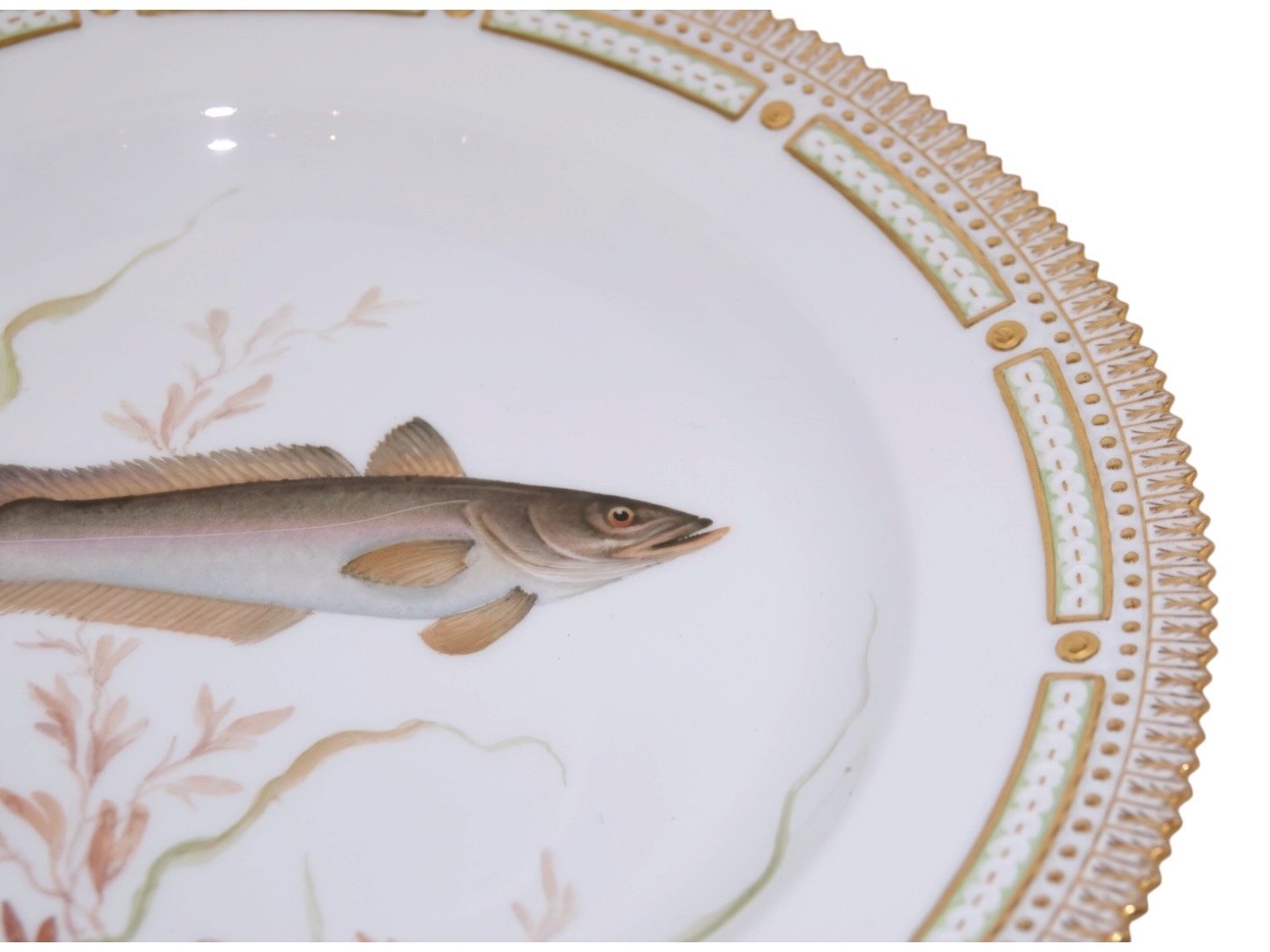 Royal Copenhagen Flora Danica, middagstallerken dekoreret med fisk.
