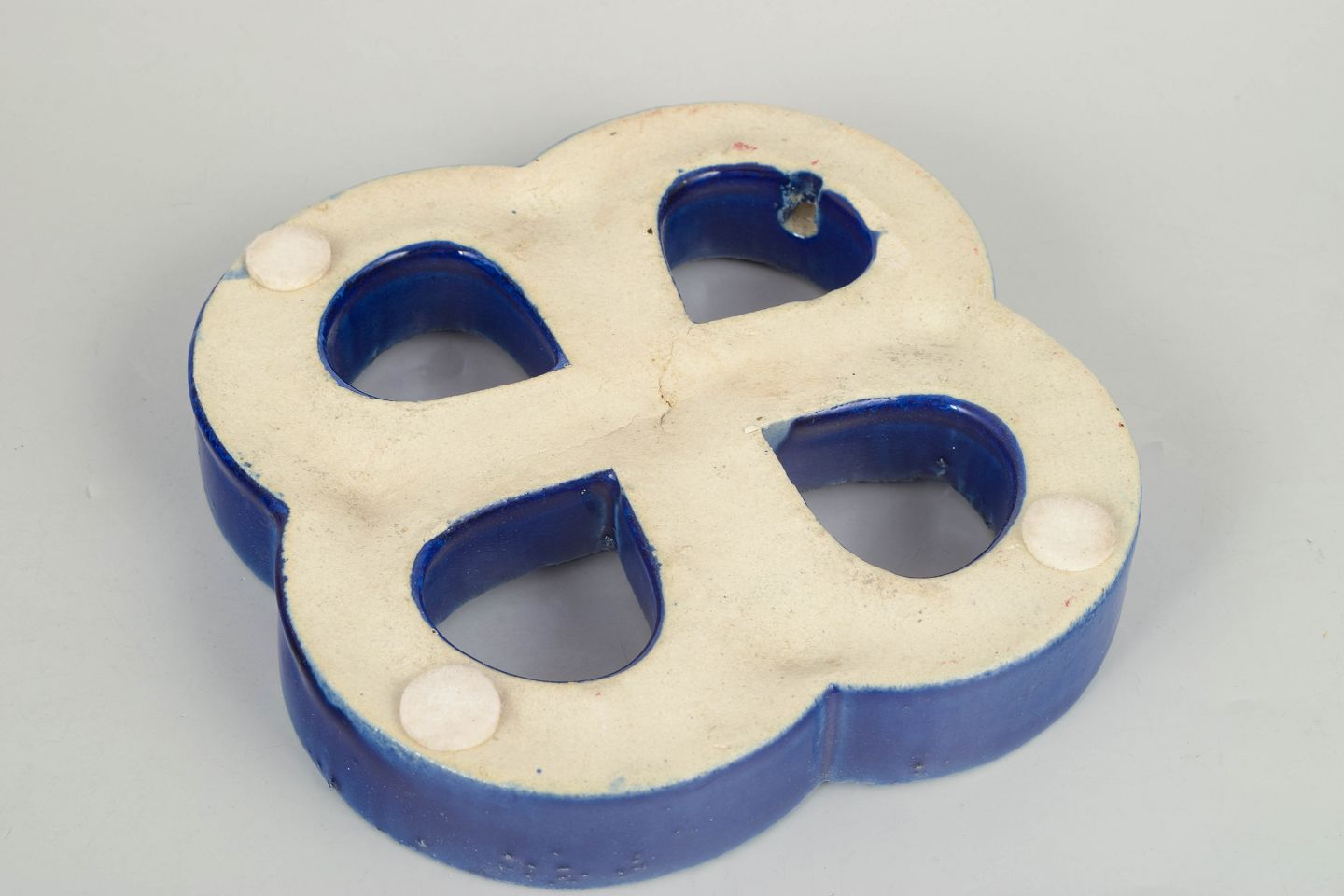 Dekorativt vægrelief i stentøj med organisk firkløverform og gennemgående åbninger. Udført med dyb blå, levende glasur med bobleeffekt og variation i overfladen. Bagside med hul til ophæng.