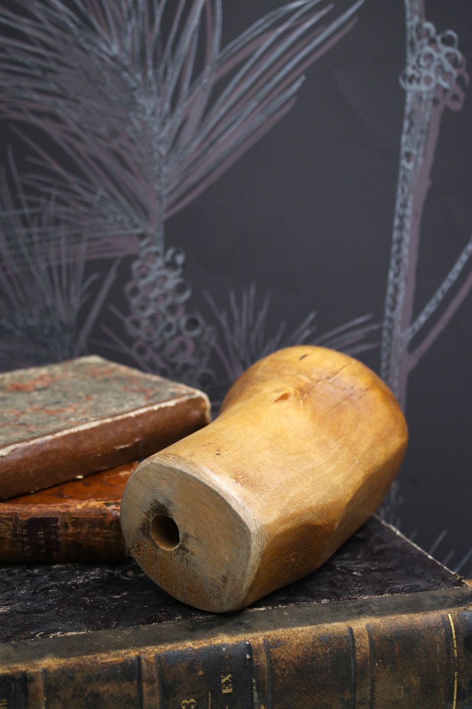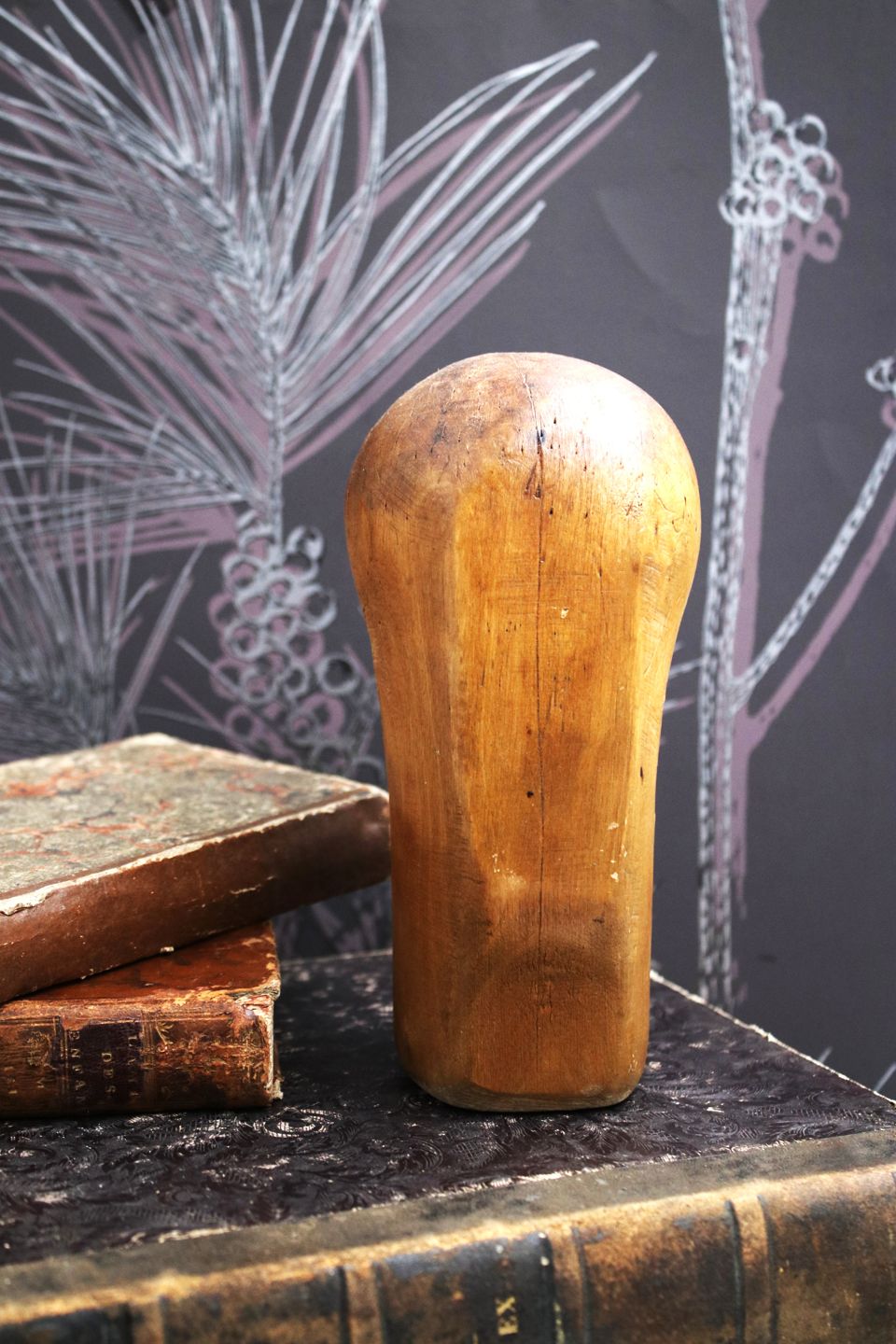 Dekorativt , antikt mini hatte hoved i udskåret træ med en rigtig fin patina...