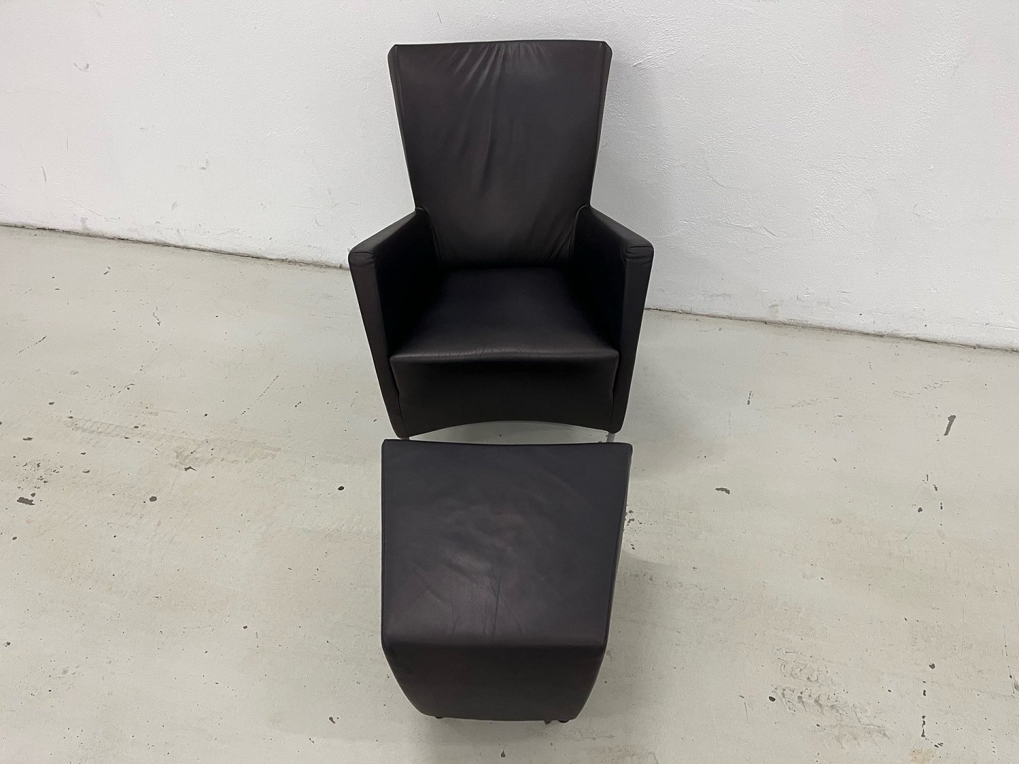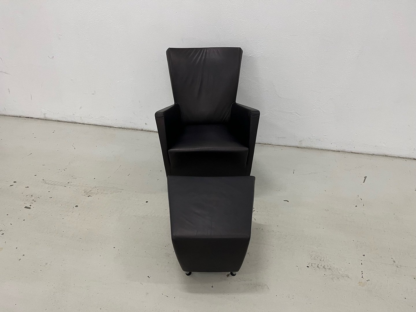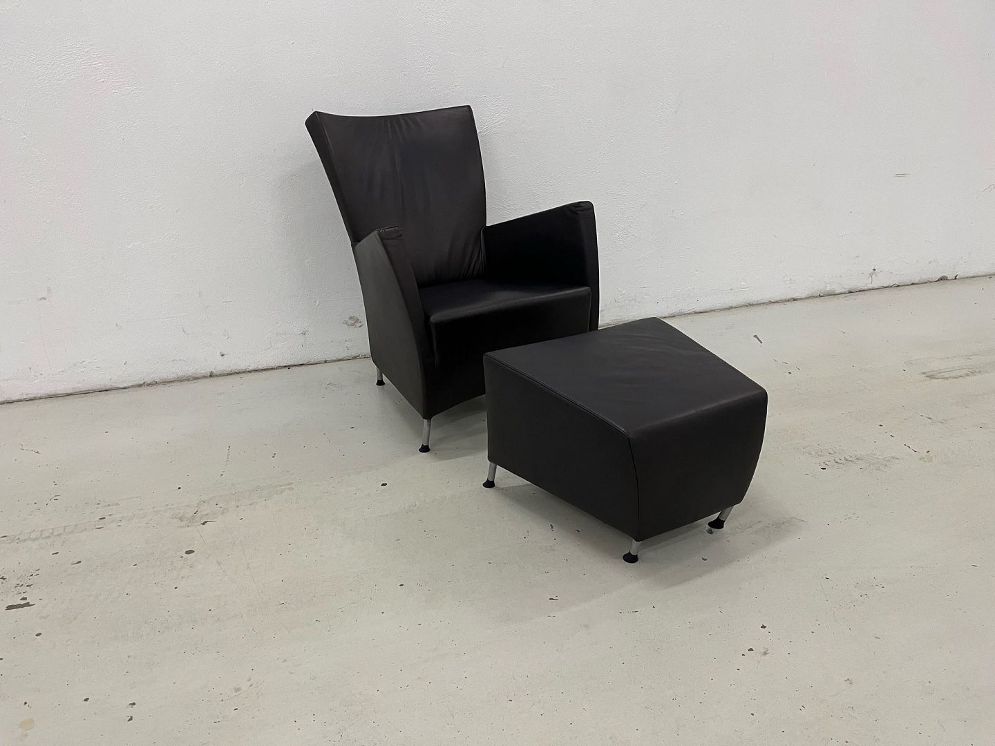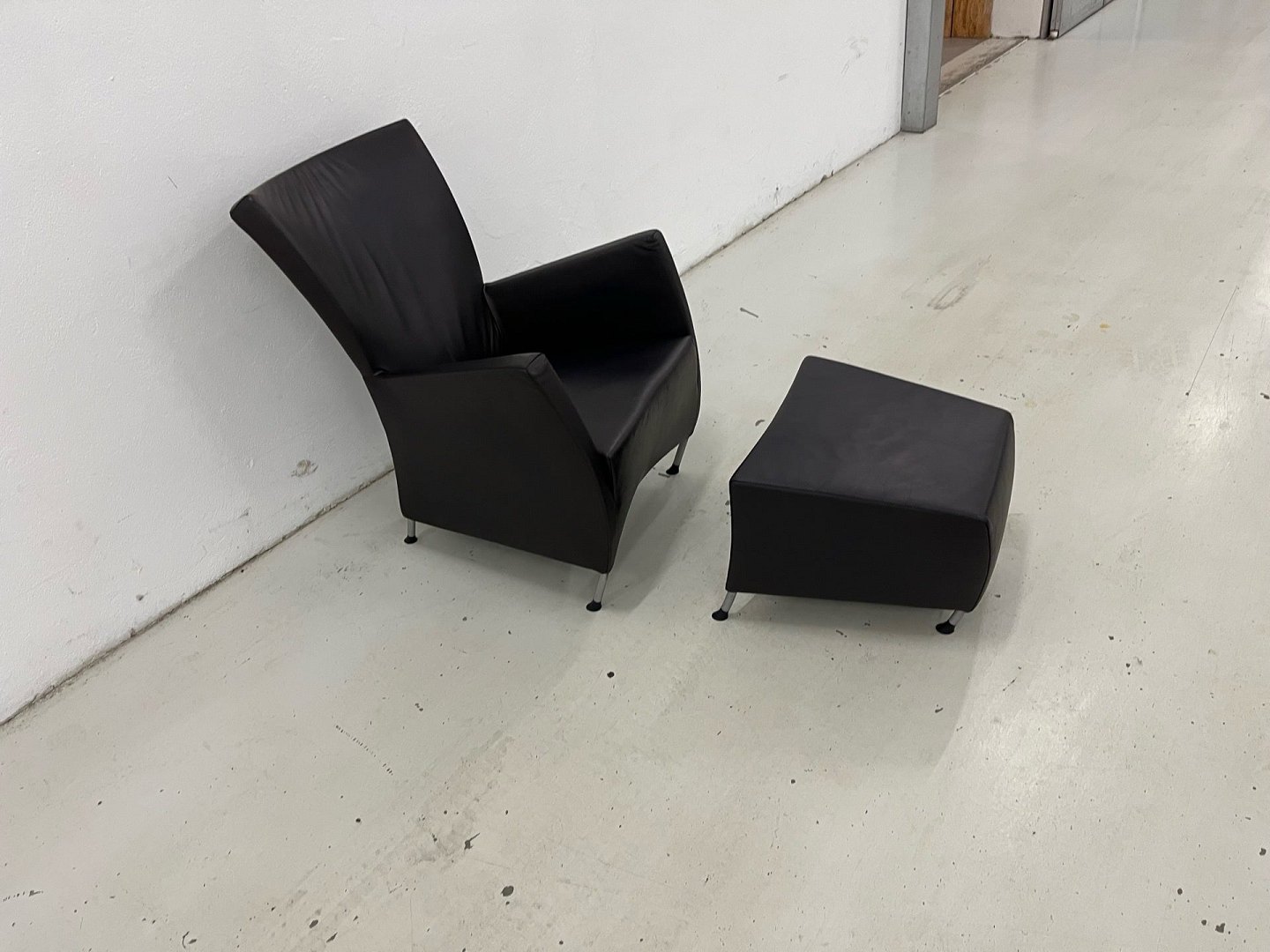 Windy stol m/skammel i sort Panama læder og med ben i forkromet stål.