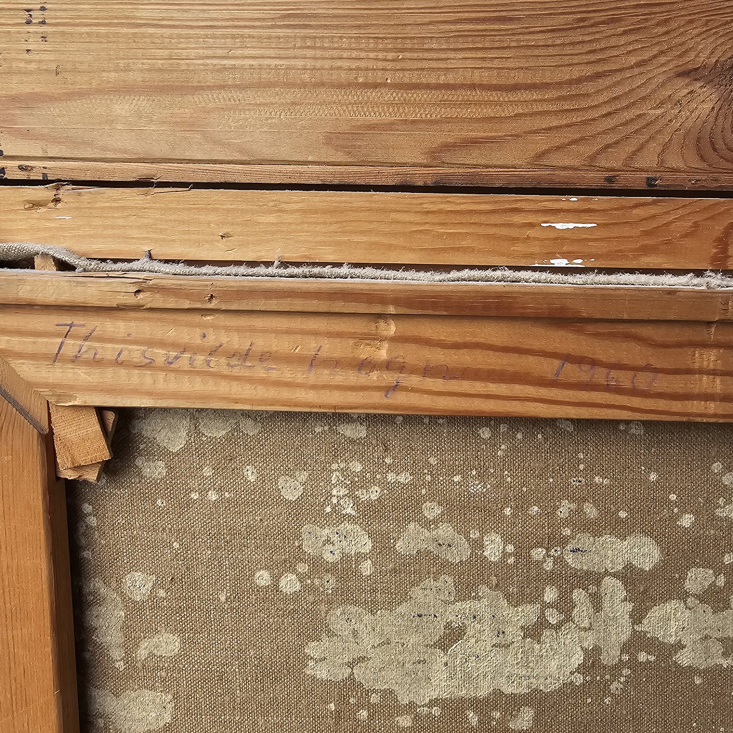 Oliemaleri på lærred med titlen Tisvilde Hegn. Monteret i sortmalet ramme med abstrakt naturmotiv, dateret 1960