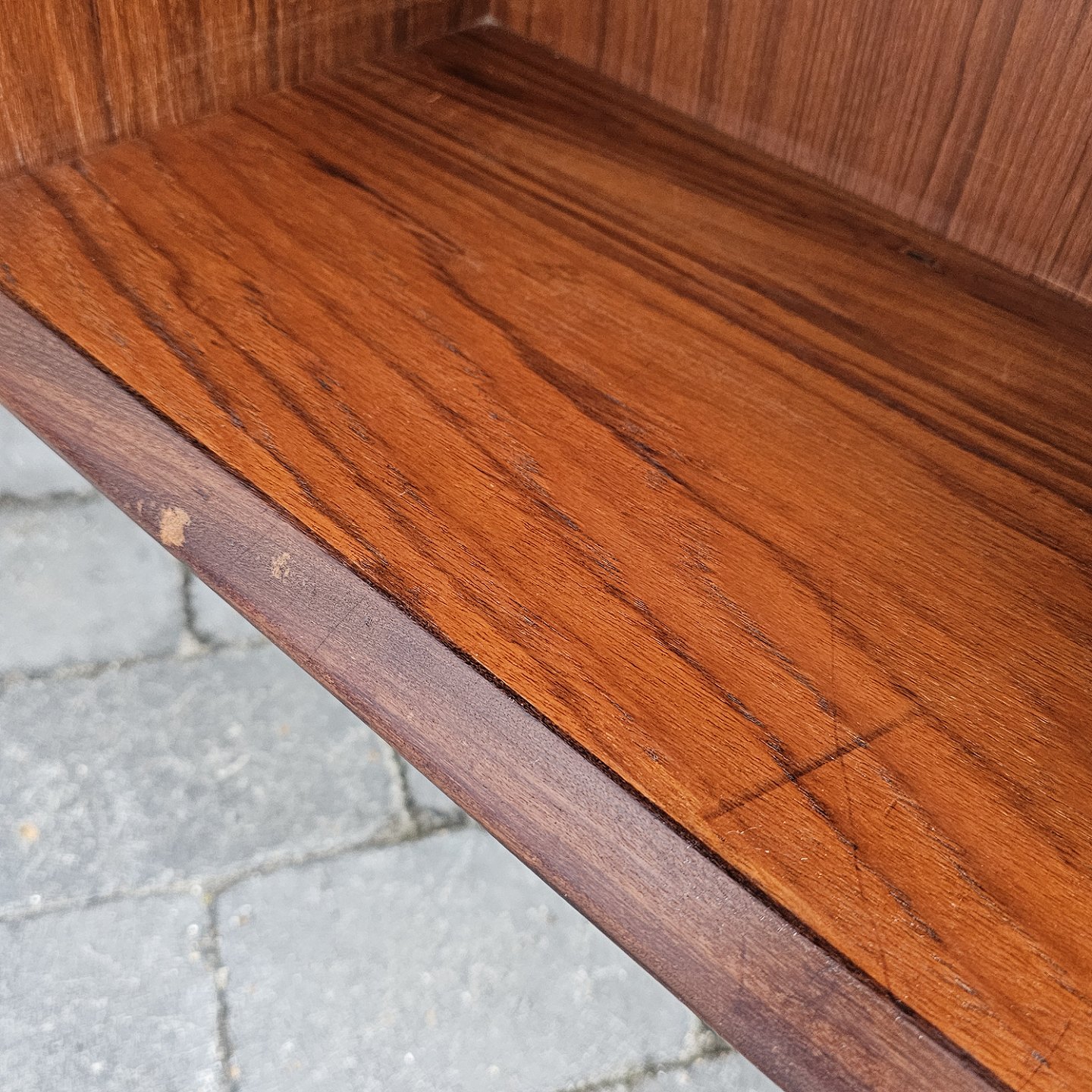Skrivebord i teaktræ med skuffer i begge sider, øverste skuffer med nøgle