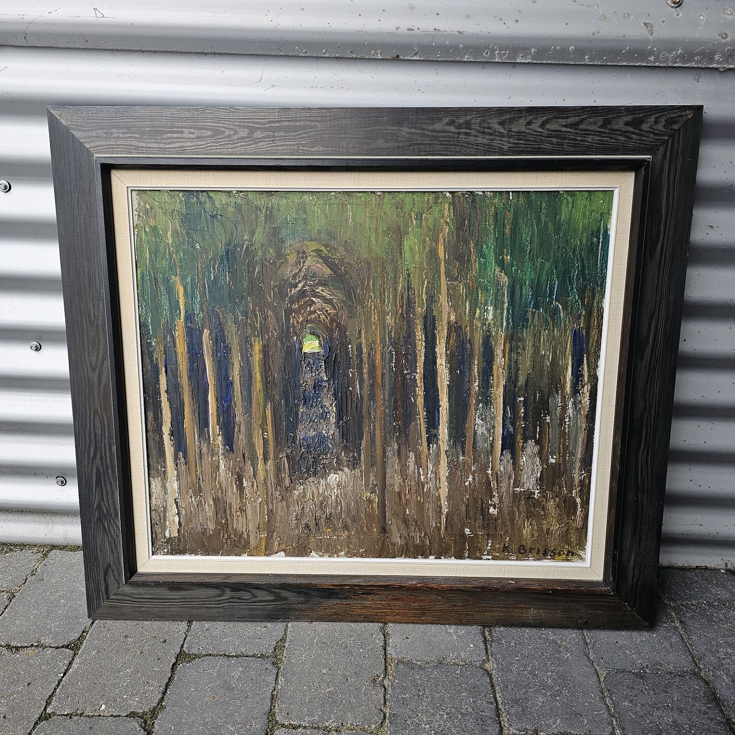 Oliemaleri på lærred med titlen Granskov. Monteret i sortmalet ramme med motiv af en sti gennem grantræer, dateret 1960
