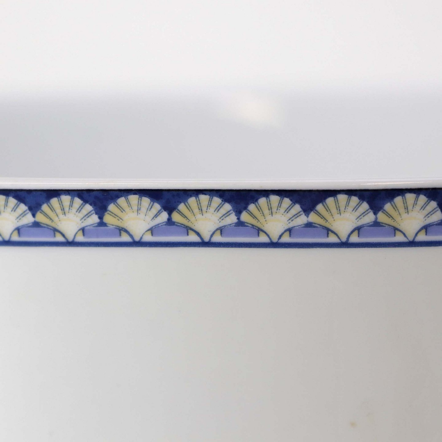 Service i glat hvid porcelæn med blåt bånd og dekoration af gule vifteformede strandskaller. Stellet kan gå i opvaskemaskinen.