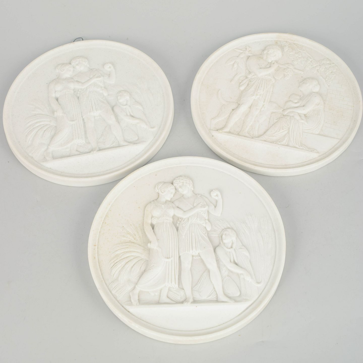 Relieffer i hvidt uglaseret porcelæn med klassiske motiver efter Bertel Thorvaldsen, udført i fin biscuit med detaljeret figurdekoration og ophæng på bagsiden. Første sortering.