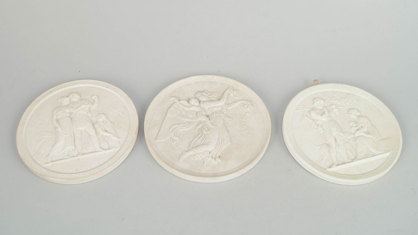 Royal Copenhagen, sæt af tre biscuit vægrelieffer efter Thorvaldsen.