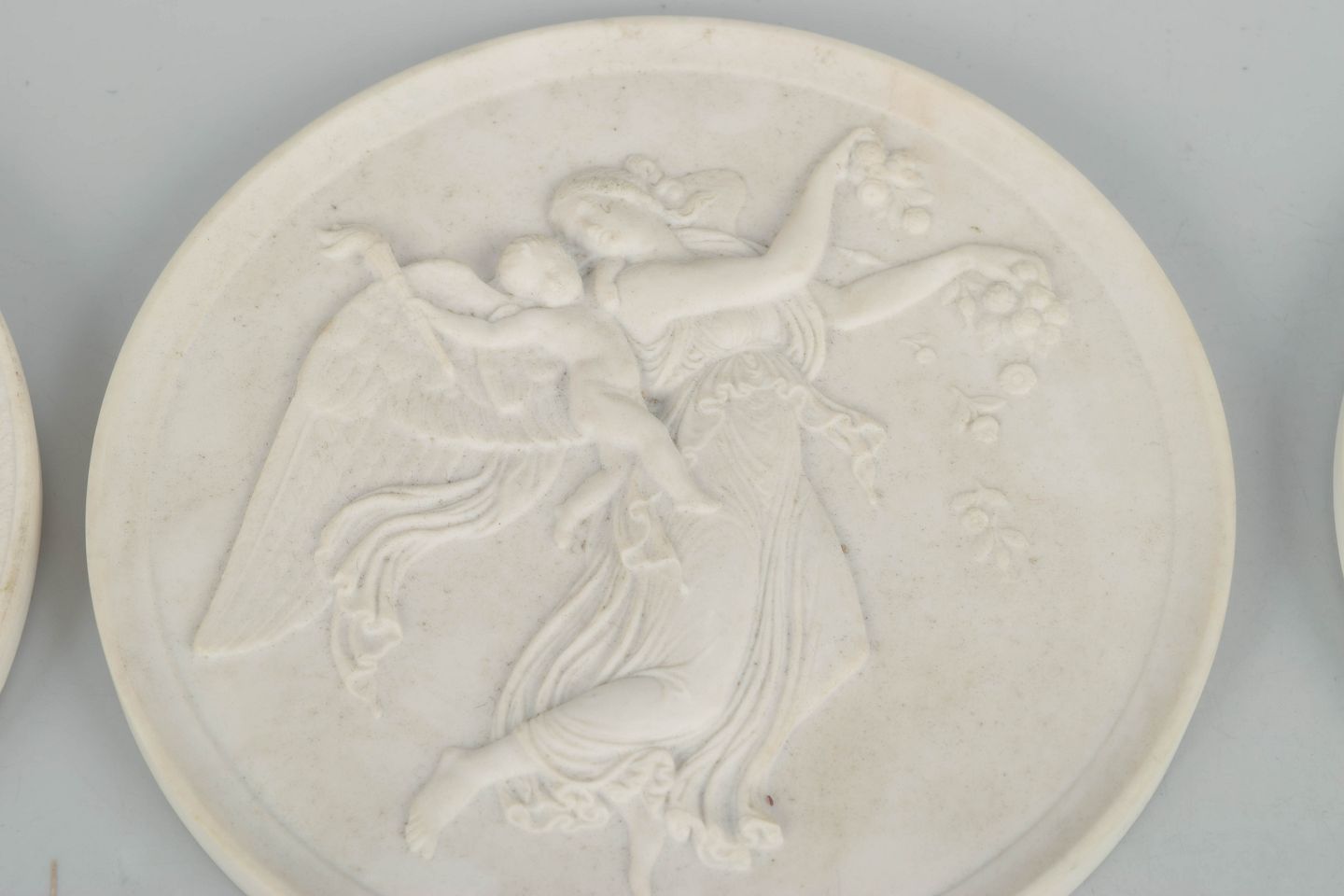 Relieffer i hvidt uglaseret porcelæn med klassiske motiver efter Bertel Thorvaldsen, udført i fin biscuit med detaljeret figurdekoration og ophæng på bagsiden. Første sortering.