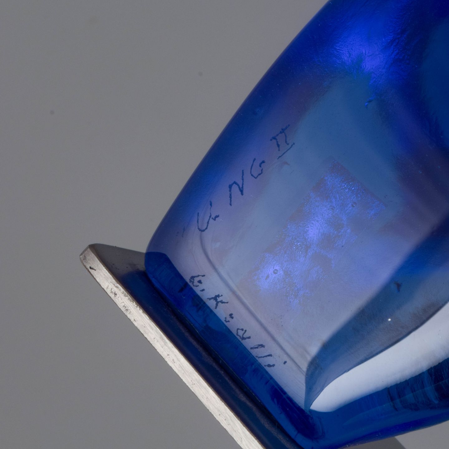 Organisk formet skulptur i mundblæst glas med dyb blå farve og indkapslede figurative elementer. Signeret af kunstneren og udført i eget værksted.