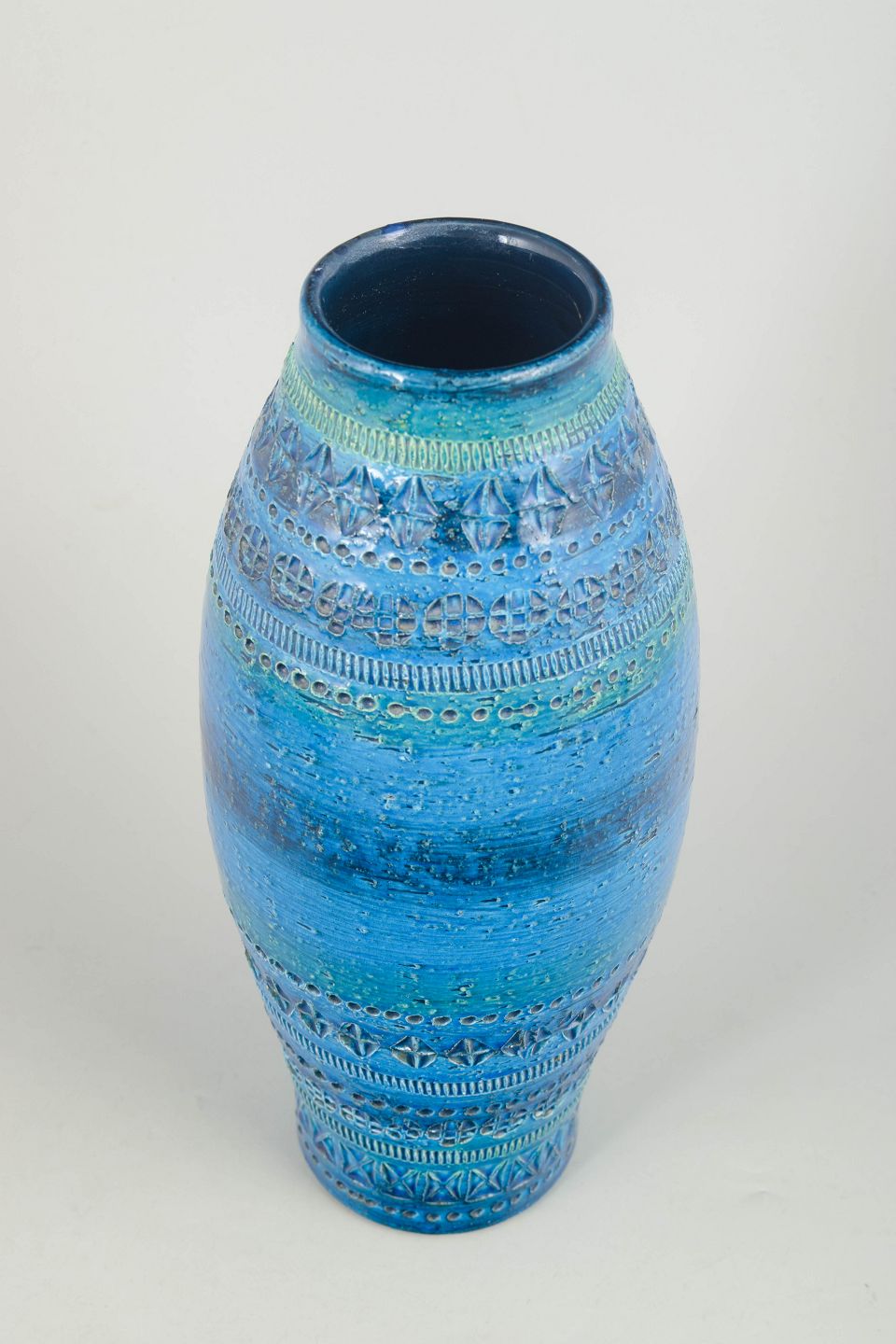 Stor dekorativ stentøjsvase med cylindrisk form og let tilspidset hals, udført med karakteristisk riflet struktur og glasur i nuancer af blå og turkis med subtile variationer.