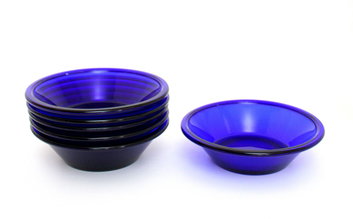 Holmegaard, Else, Tykmælksskål i presset kobolt blå glas. Designet i 1938 og produceret frem til slut 1970'erne i varierende størrelser, men samme form og blev kaldt ymerskål