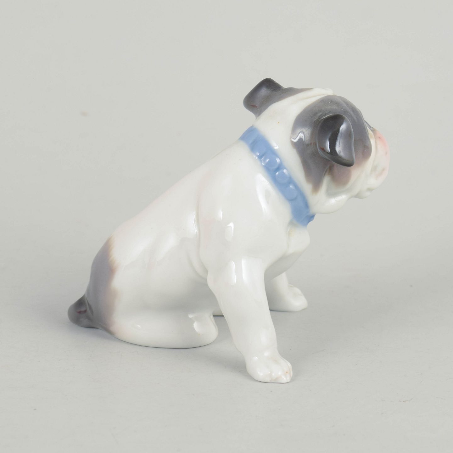 Naturalistisk udformet porcelænsfigur af fransk bulldog med håndmalede detaljer i grå, hvide og rosa nuancer.