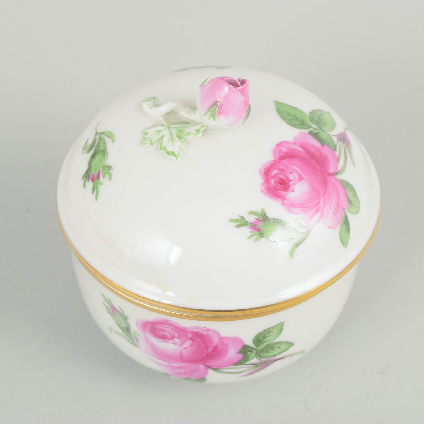Sukkerskål i porcelæn med låg, håndmalet med polykrome blomster og guldkant. Dekoreret med større rosenmotiver og knopformet låggreb i klassisk Meissen stil fra midten af det 20. århundrede. Undersiden mærket med Meissen krydssværd.