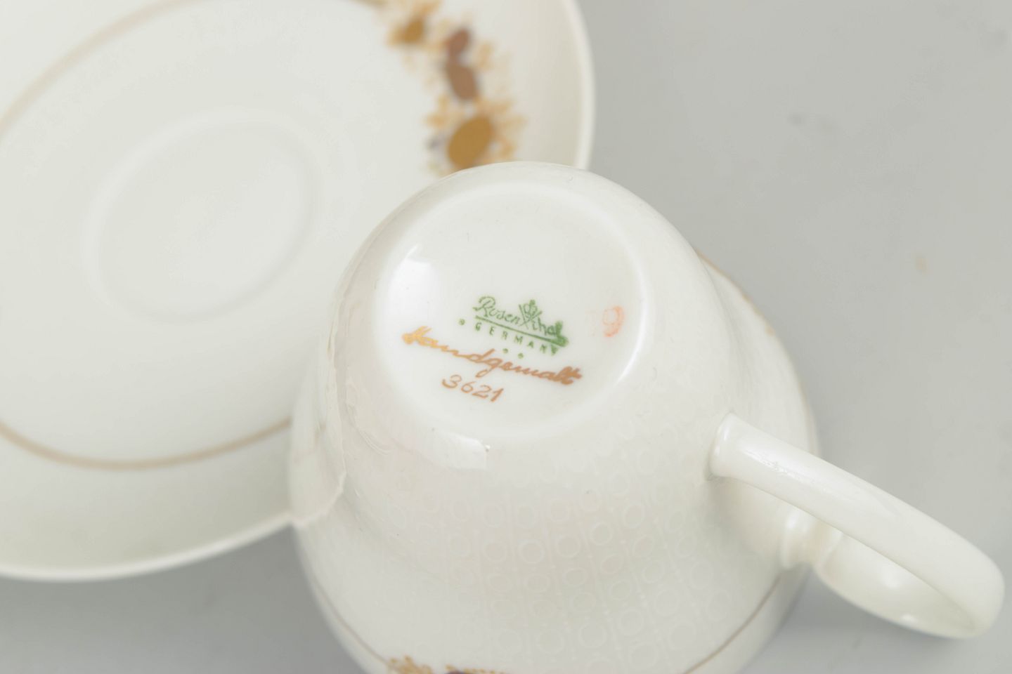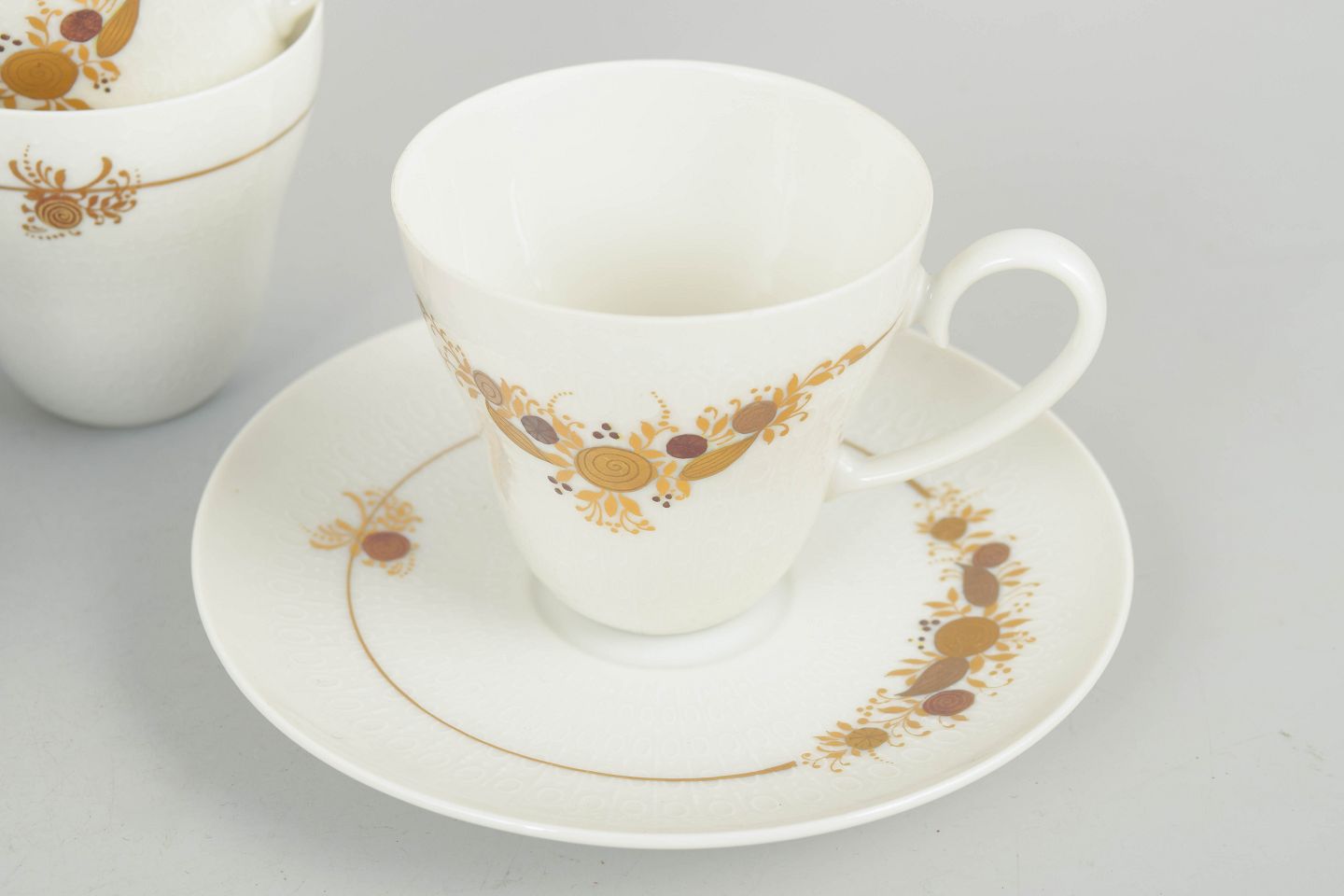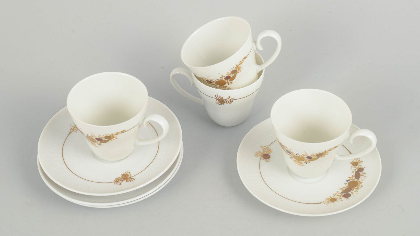 Sæt bestående af fire kaffekopper med tilhørende underkopper i porcelæn dekoreret med det karakteristiske blomsterornament fra Romanze-serien. Dekorationen fremstår i gyldne nuancer med fine detaljer og et elegant, romantisk udtryk, typisk for Wiinblads formsprog i 1970’erne.