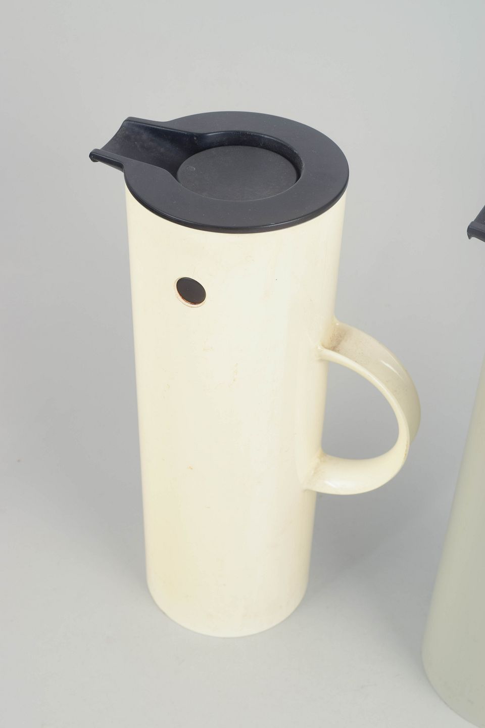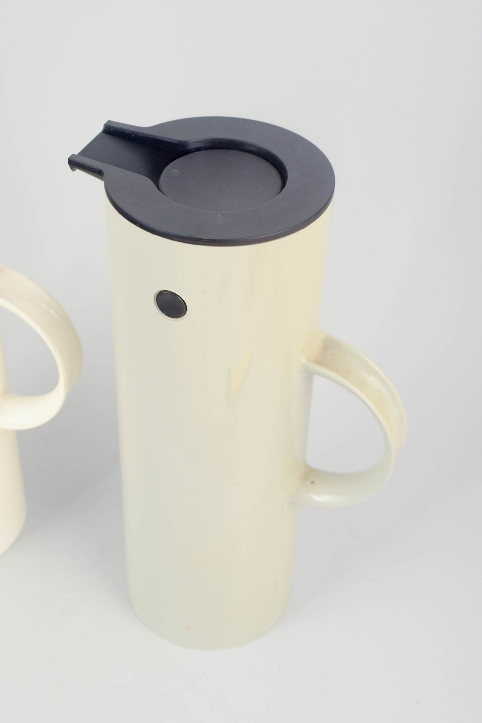 To cylindriske termokander i lakeret metal med vippeprop og hank i kunststof. Klassisk model fra Steltons ikoniske serie, hvor funktionalitet og stramt minimalistisk formsprog er i centrum.