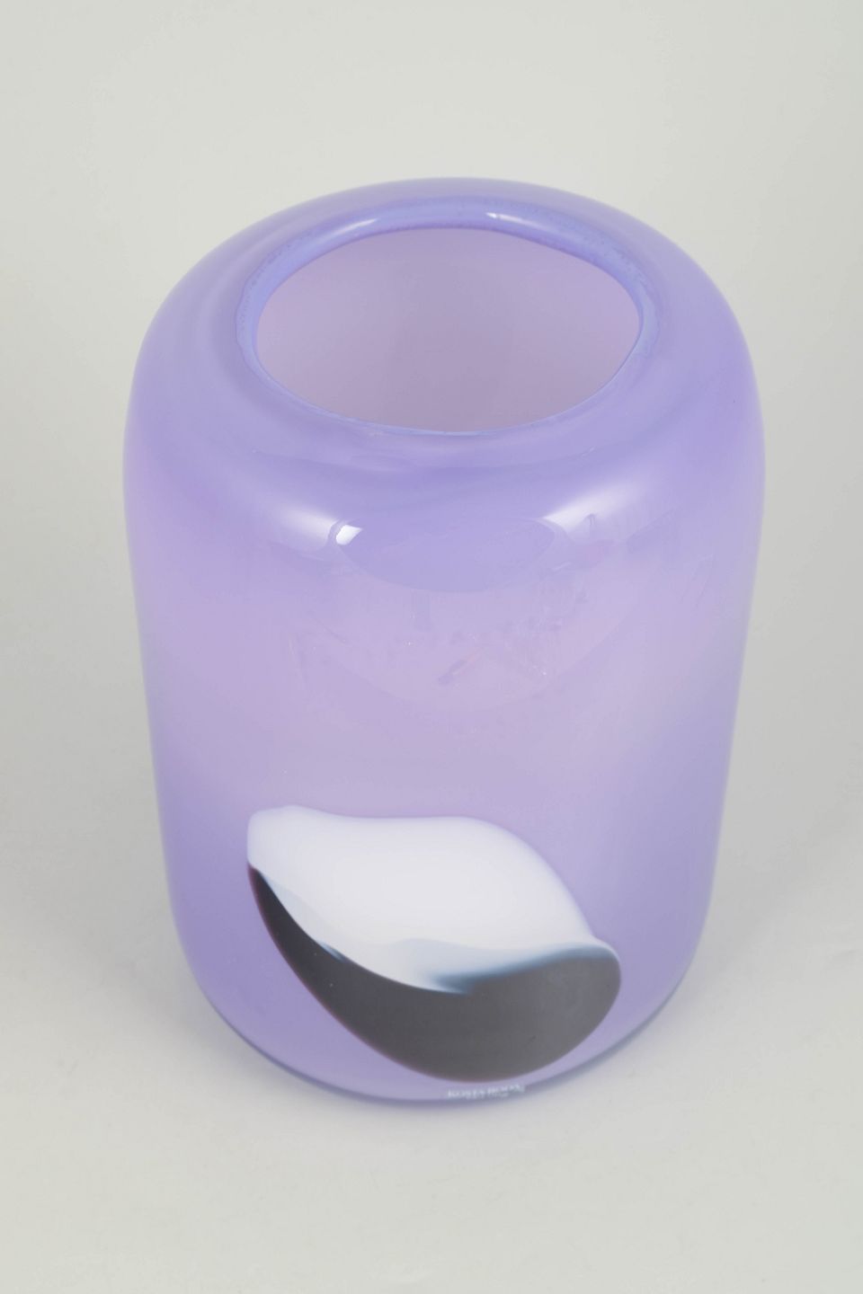 Cylindrisk kunstglasvase med blød lilla tone og indkapslet organisk form i hvid og sort. Mundblæst glas med skulpturel karakter, model 40226, signeret.