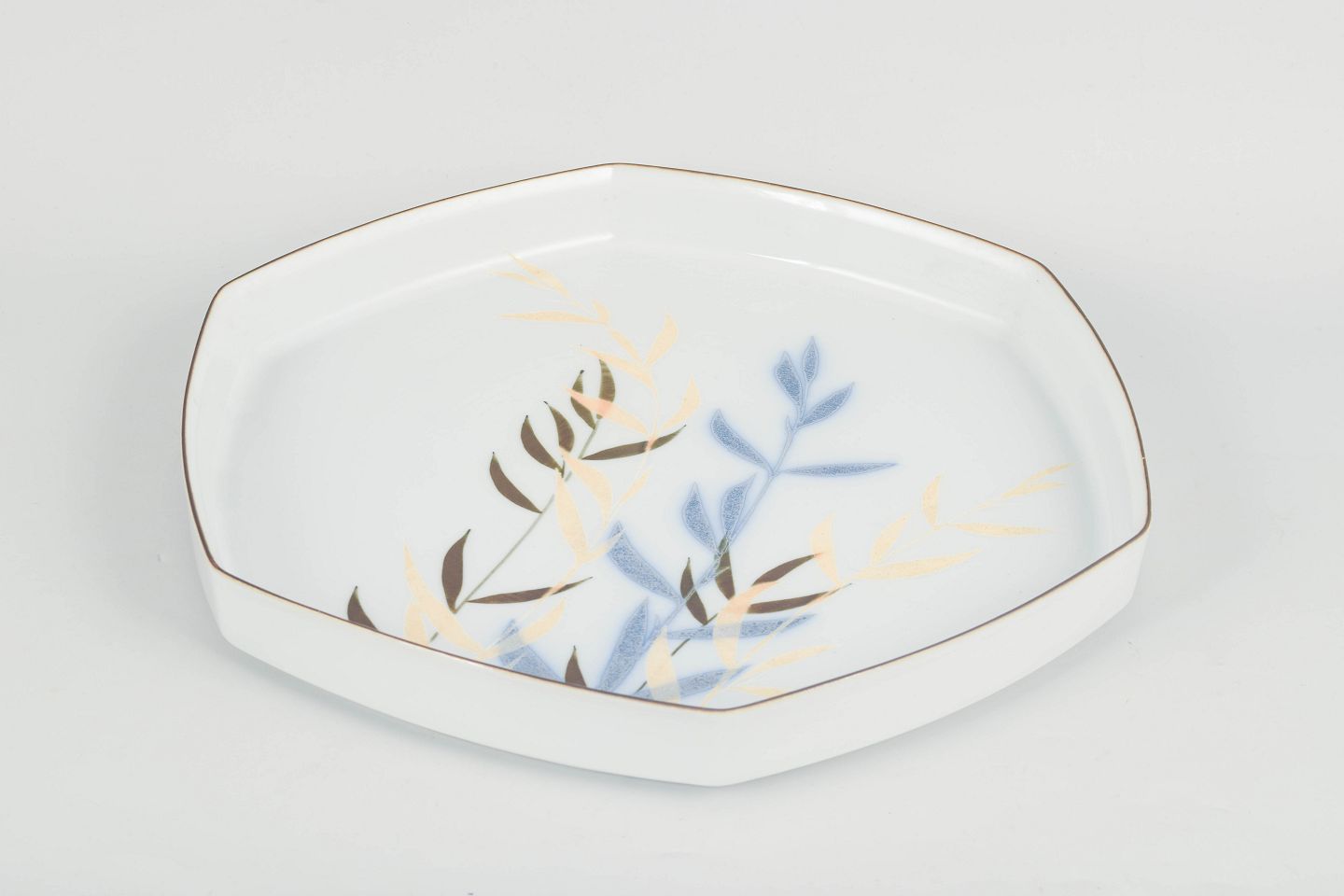 Stort ottekantet porcelænsfad med stiliseret bambusdekoration i blå, gyldne og brune nuancer. Model 22781, første sortering.