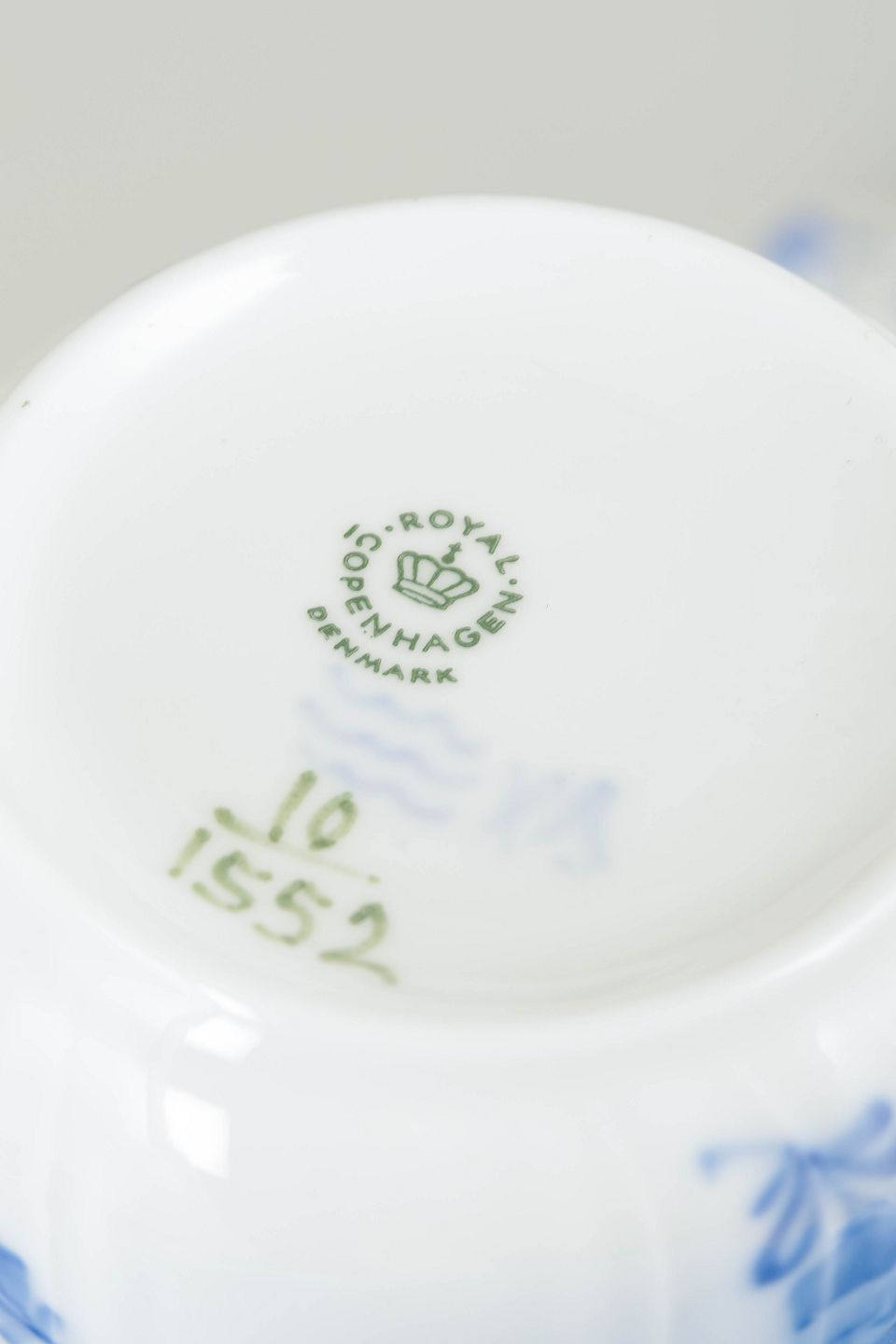 Sjældent sæt af bouillonkopper med låg i porcelæn, dekoreret i det klassiske håndmalede Blå Blomst Svejfet mønster. Model 10/1552, første sortering, dateret 1962.