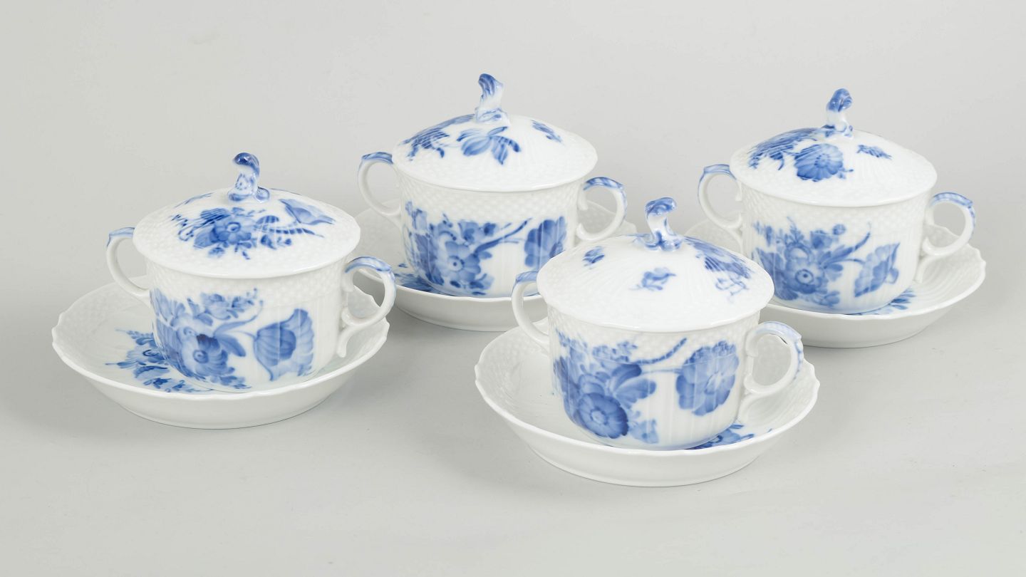 Royal Copenhagen Blå Blomst Svejfet, sæt af fire bouillonkopper med underkopper.