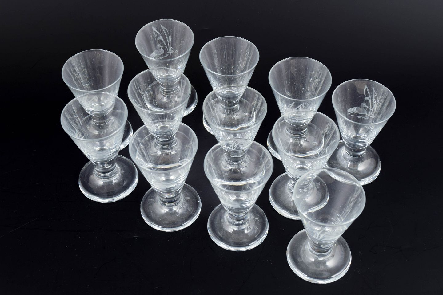 Skandinavisk glasværk, sæt af tolv snaps glas med ande- og sivmotiv.