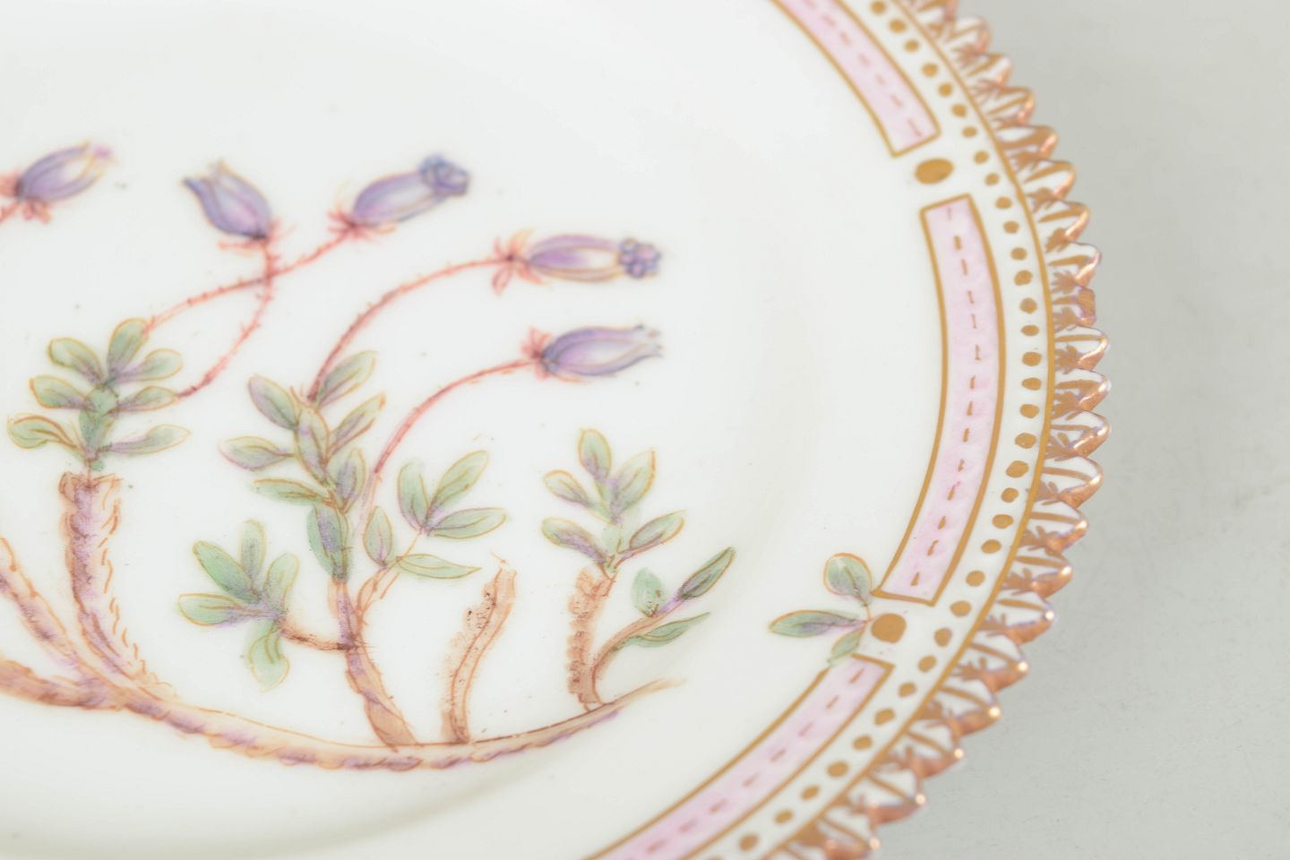 Hånddekoreret porcelænstallerken med botanisk motiv fra Flora Danica-serien, hjemmedekoreret, fint udført med forgyldt rand og detaljerig gengivelse af planter.