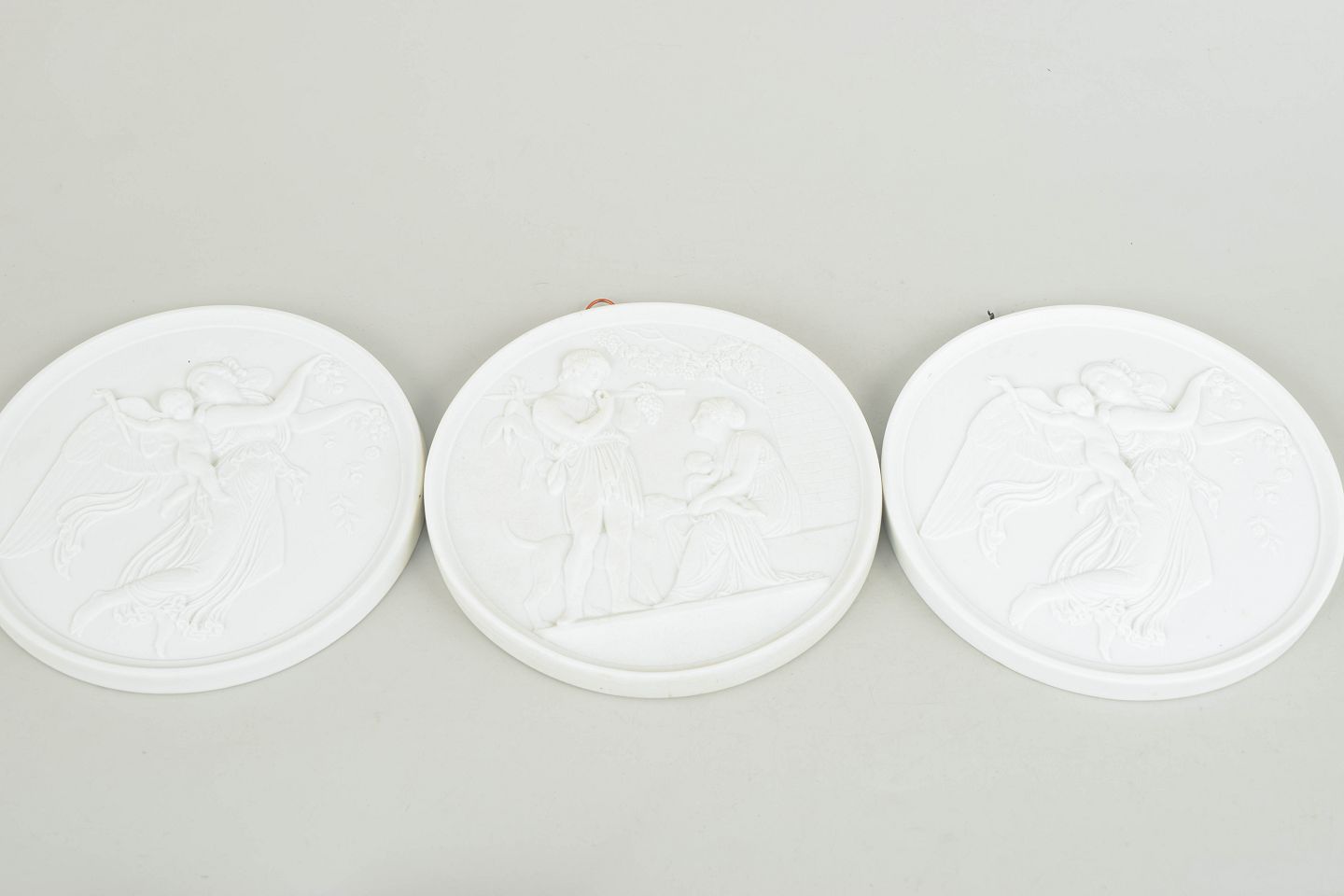 Relieffer i hvidt uglaseret porcelæn med klassiske motiver efter Bertel Thorvaldsen, udført i fin biscuit med detaljeret figurdekoration og ophæng på bagsiden. Første sortering.