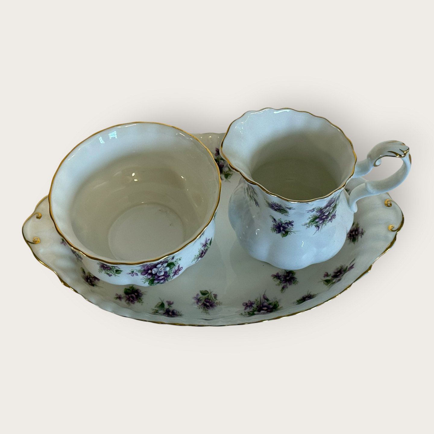 Royal Albert, Bone China, Sweet violets, Mark viol, Sukker, flødesæt på lille bakke, bakken måler 22x13cm *Perfekt stand*