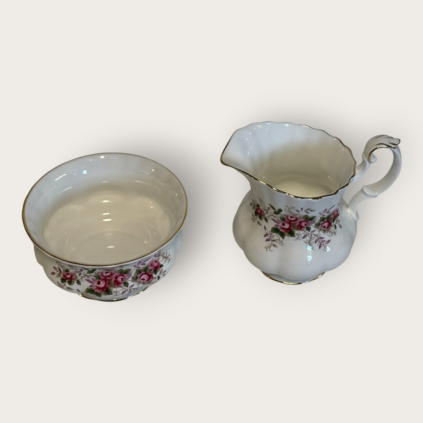 Royal Albert, Bone China, Lavender Rose, Stort Sukker og flødesæt, sukkerskål højde 6cm, diameter 11cm, flødekande ca. hxbxl 10,5x12x8,5cm *Perfekt stand*