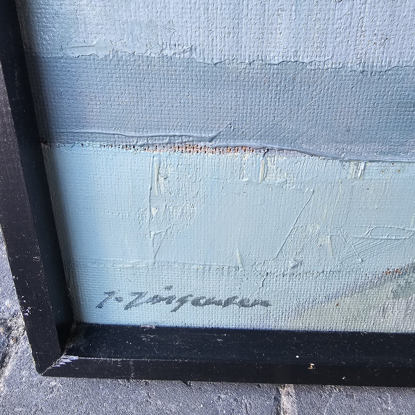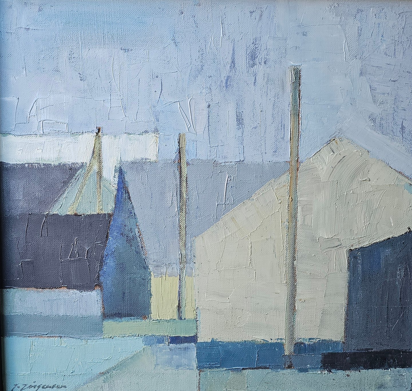 Struktureret oliemaleri på plade med motiv af huse monteret i sortmalet træramme