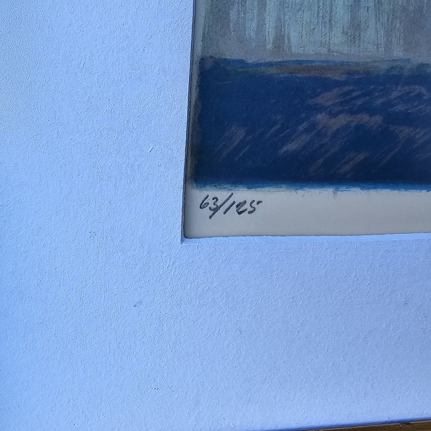 Litografi med motiv af et skur i et landskab monteret i guldmalet træramme. Nr. 63/125 og dateret 1960