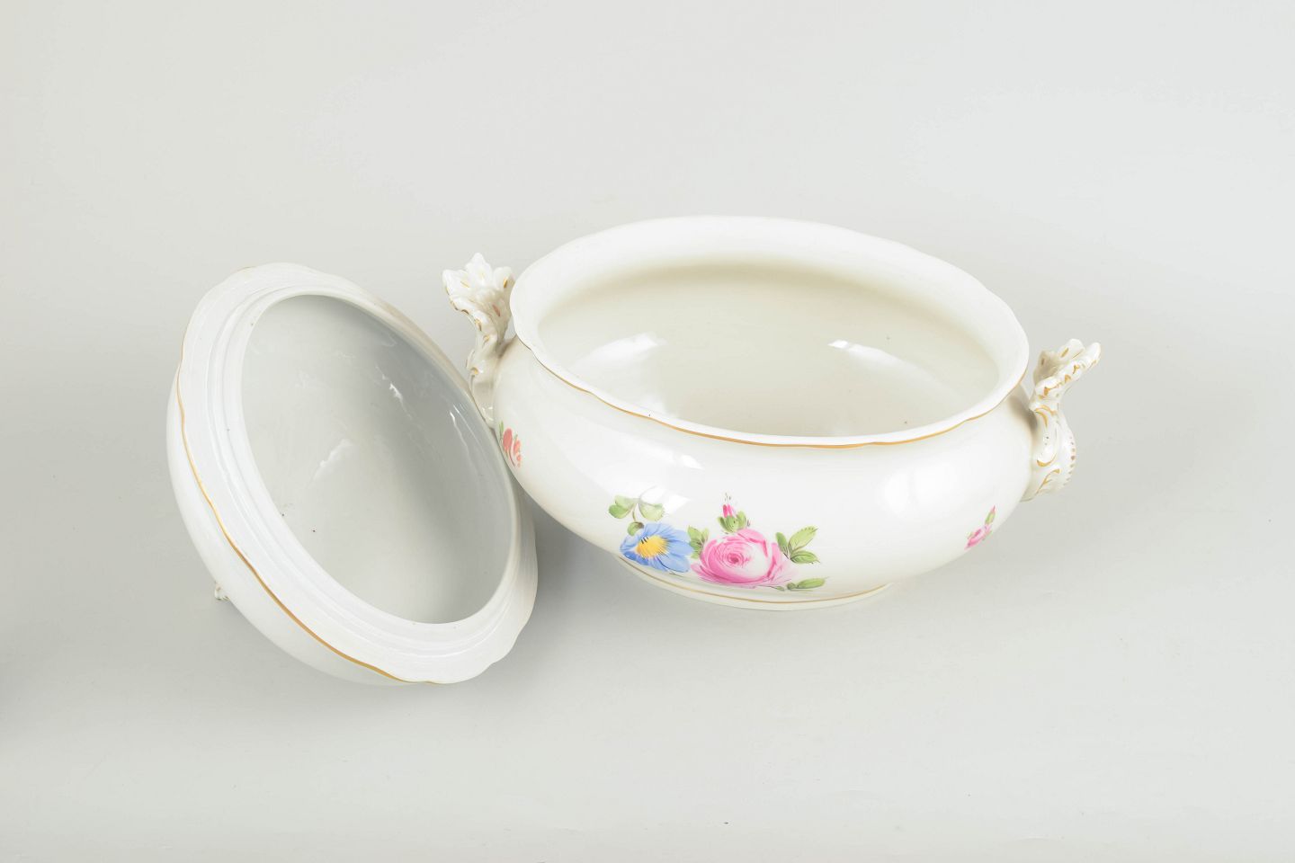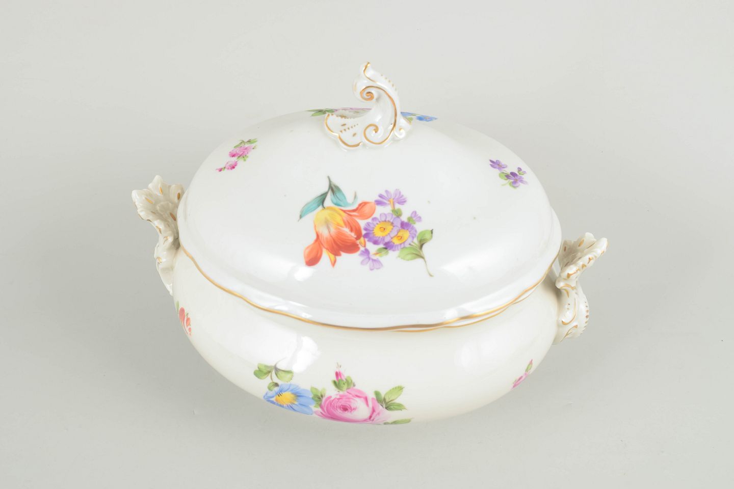 Stor terrin i håndmalet porcelæn med floral dekoration i polykrome farver og forgyldte detaljer, udført i klassisk Saksisk blomst mønster. Uden synlig fabriksmærkning.