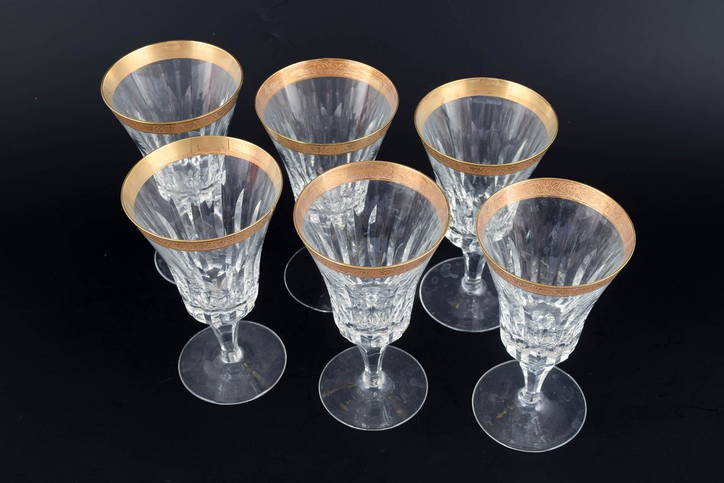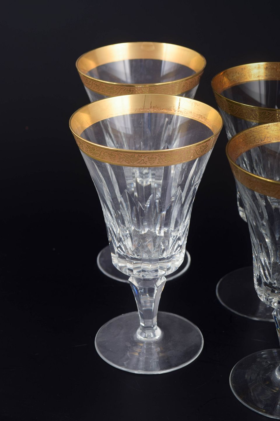 Elegante rødvinsglas i facetslebet krystal med dekoration i 24 karat guld langs kanten, udført i klassisk midten af det 20. århundrede stil.