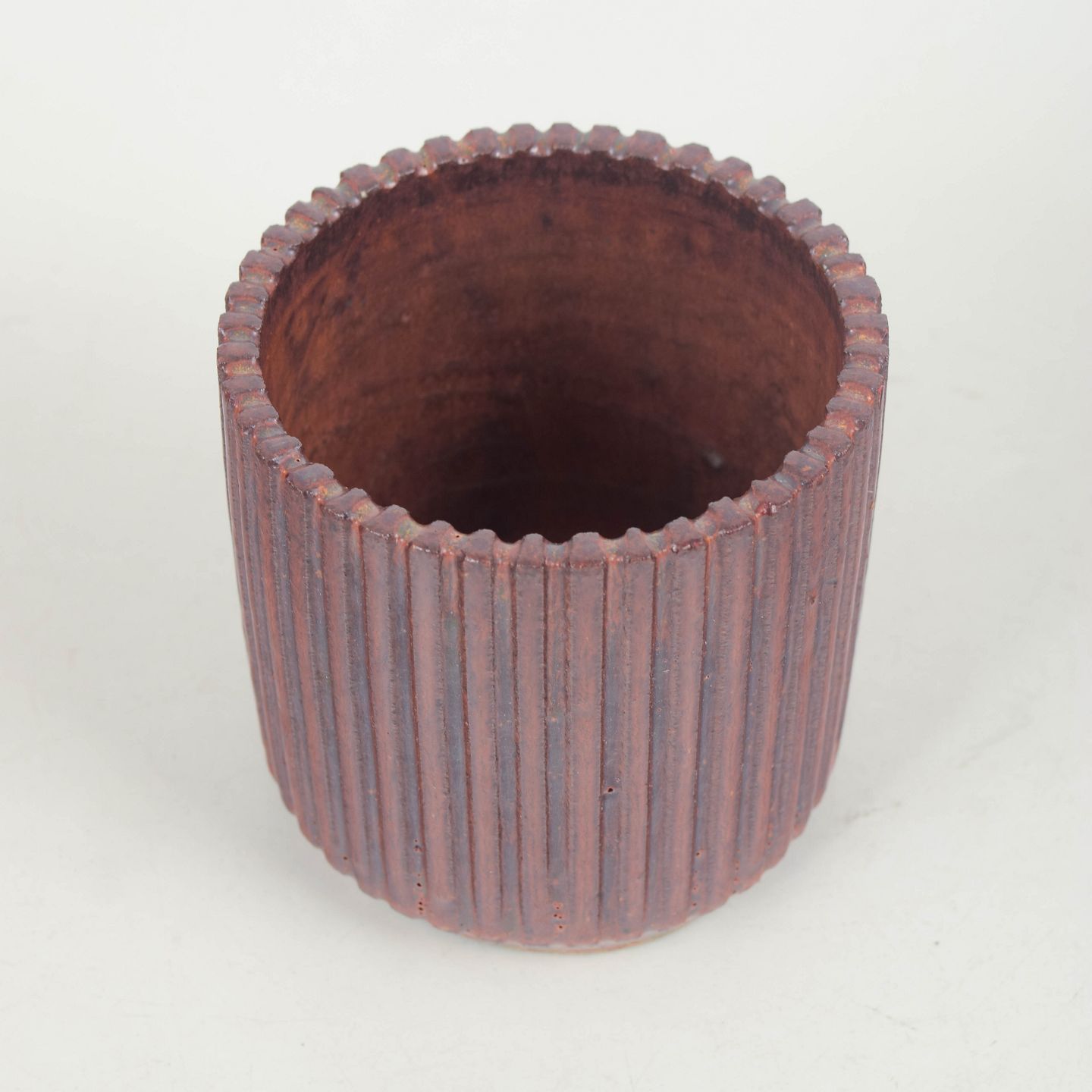 Cylindrisk vase i stentøj med lodrette riller og dyb brunviolet glasur med varme nuancer.
